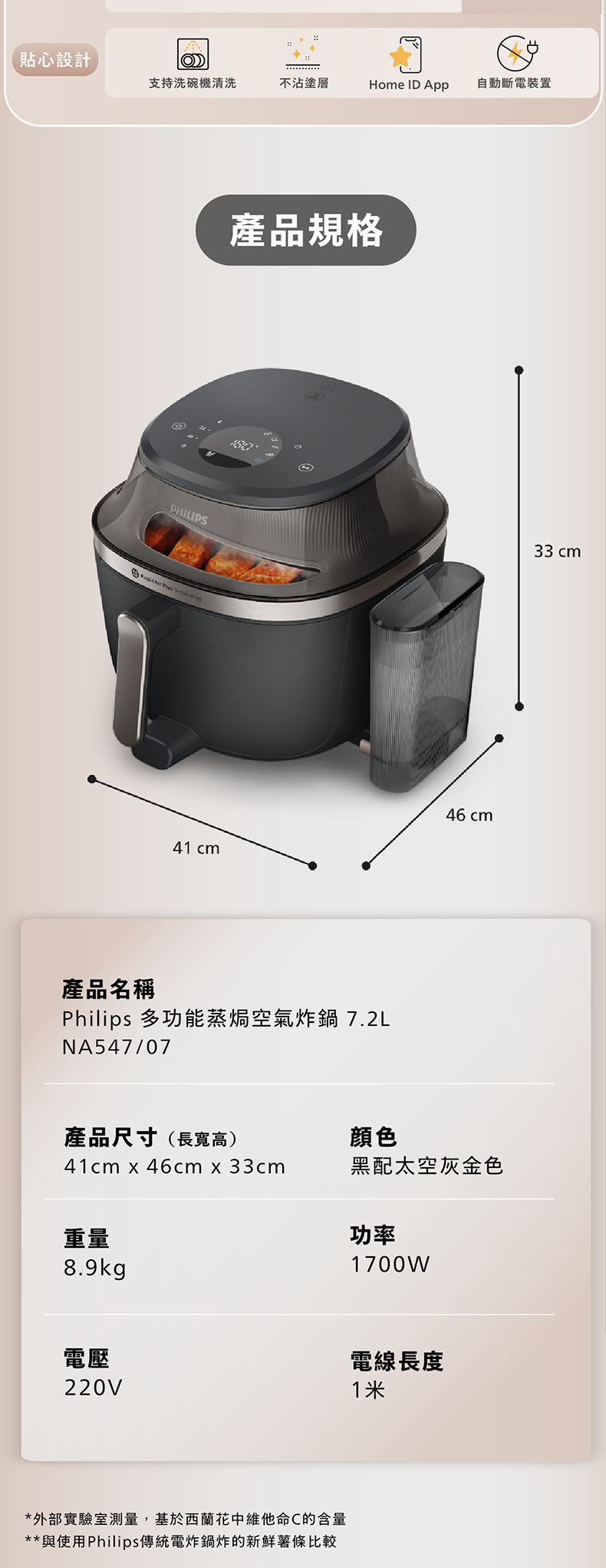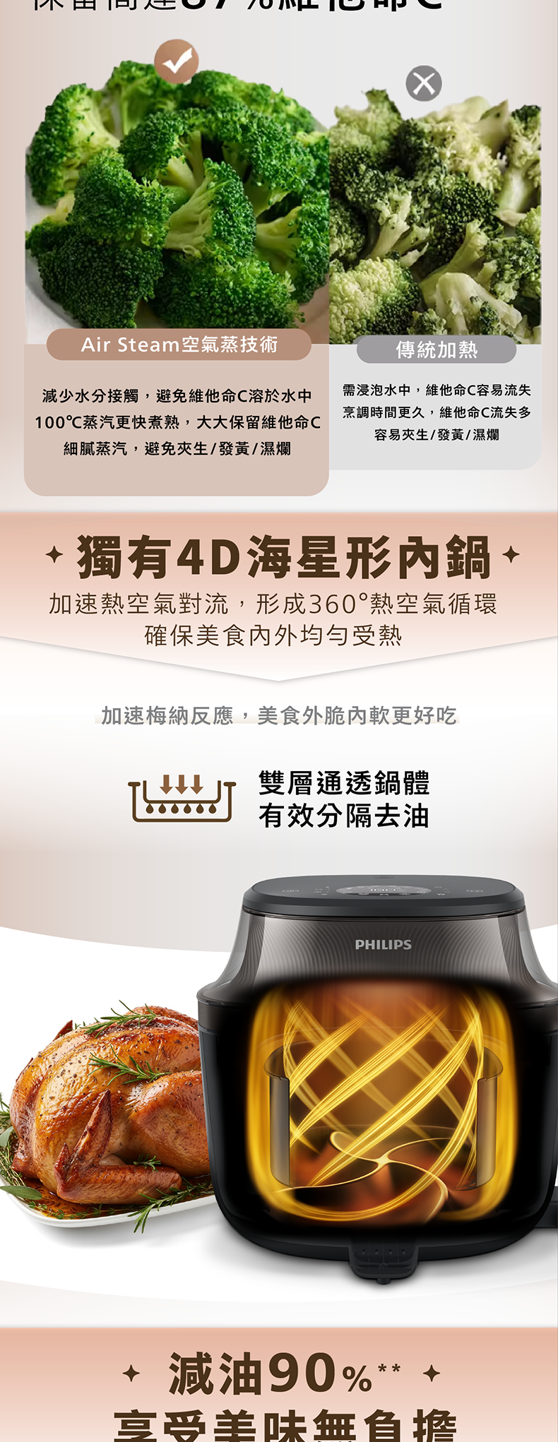 •搭配專利熱空氣循環技術,與傳統深度油炸特定食材(如薯條)的油脂含量相比,在特定測試條件下可減少高達90%的油脂攝入**,提供更輕盈的飲食選擇,減輕傳統油炸帶來的油膩負擔
