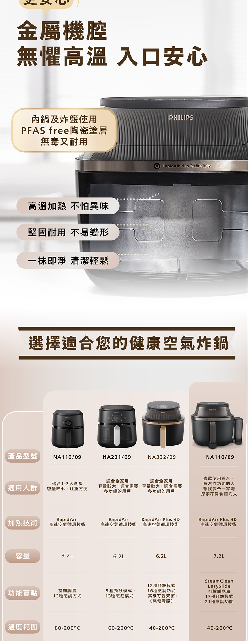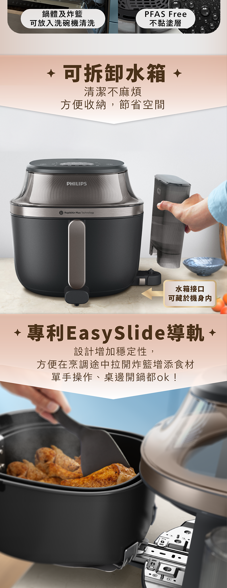 集煎炸、烤、烘、蒸功能, 一部頂替4大廚電功能,滿足多項烹飪需求。創新蒸汽炸模式烹調出外脆鮮嫩的美食,解鎖更多烹調可能性。全新可拆卸水箱設計,體驗更方便清潔與收納,節省空間。一鍵自動清潔模式透過高溫溶解頑固油跡,令清潔更輕鬆。7.2公升容量,内鍋採用PFAS free陶瓷塗層,全家食用更安全。