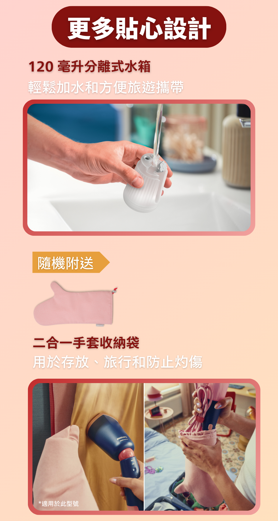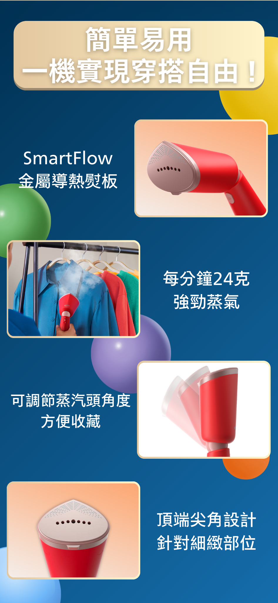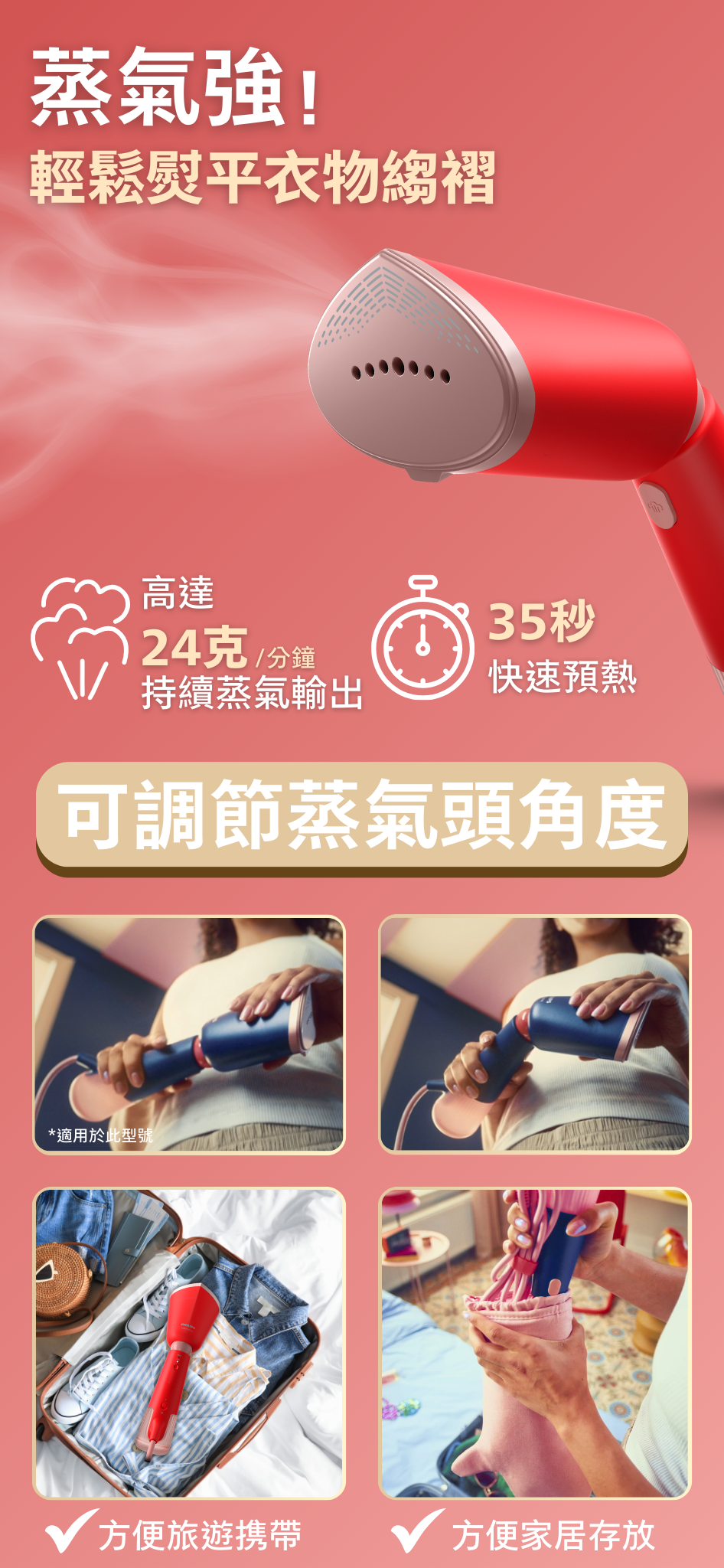 • 纖巧機身,可調校角度蒸氣噴頭,方便收藏和旅遊使用