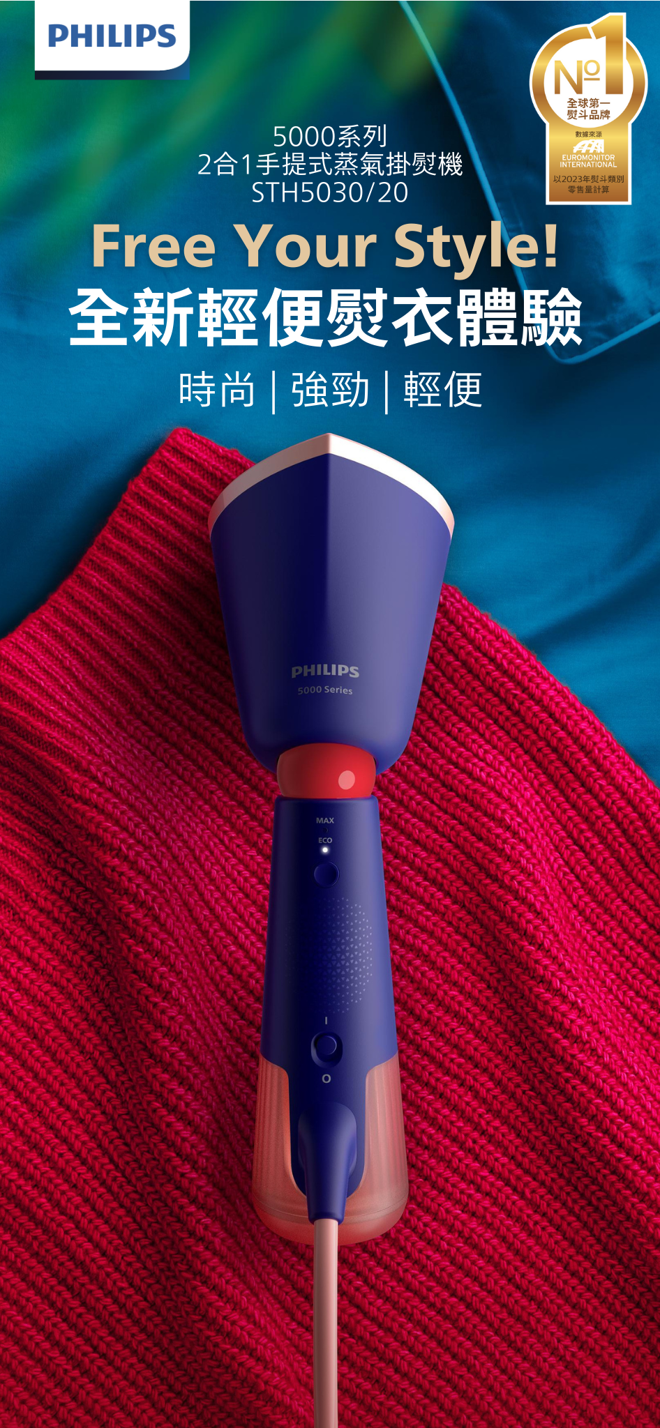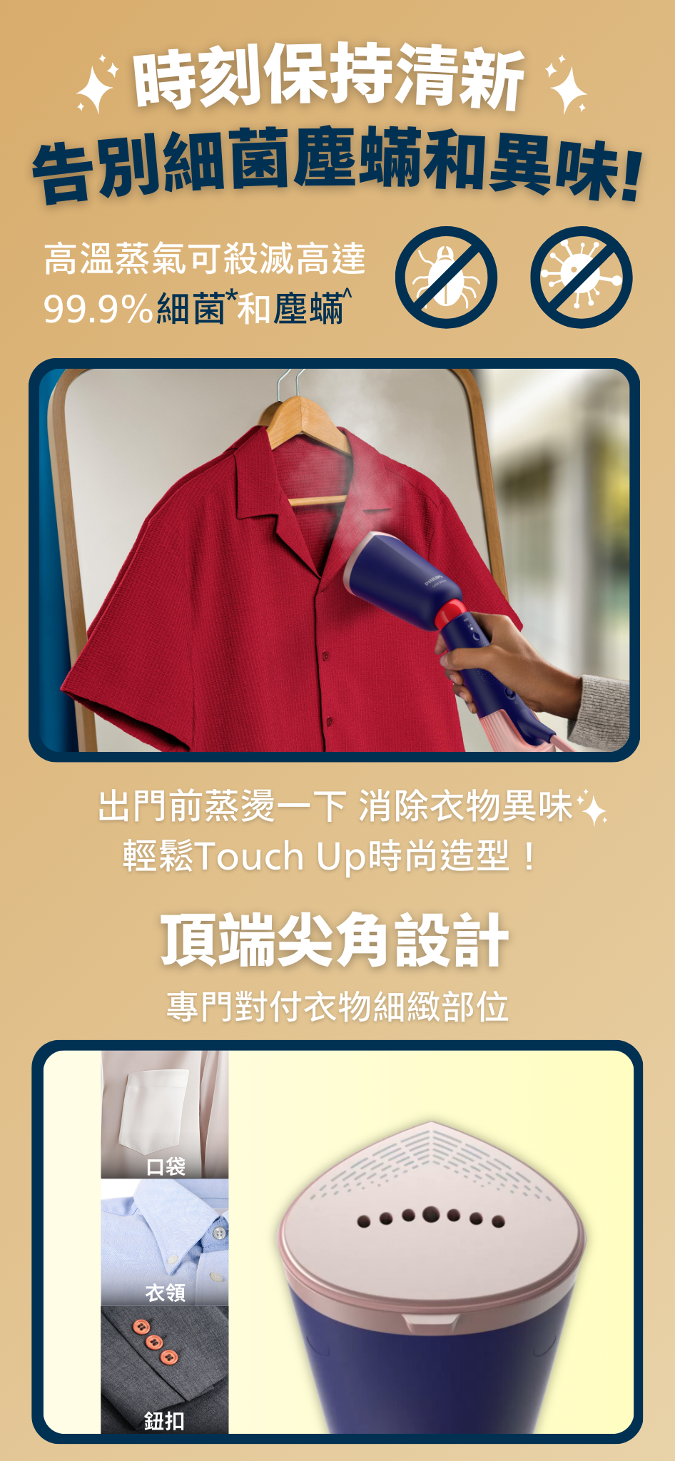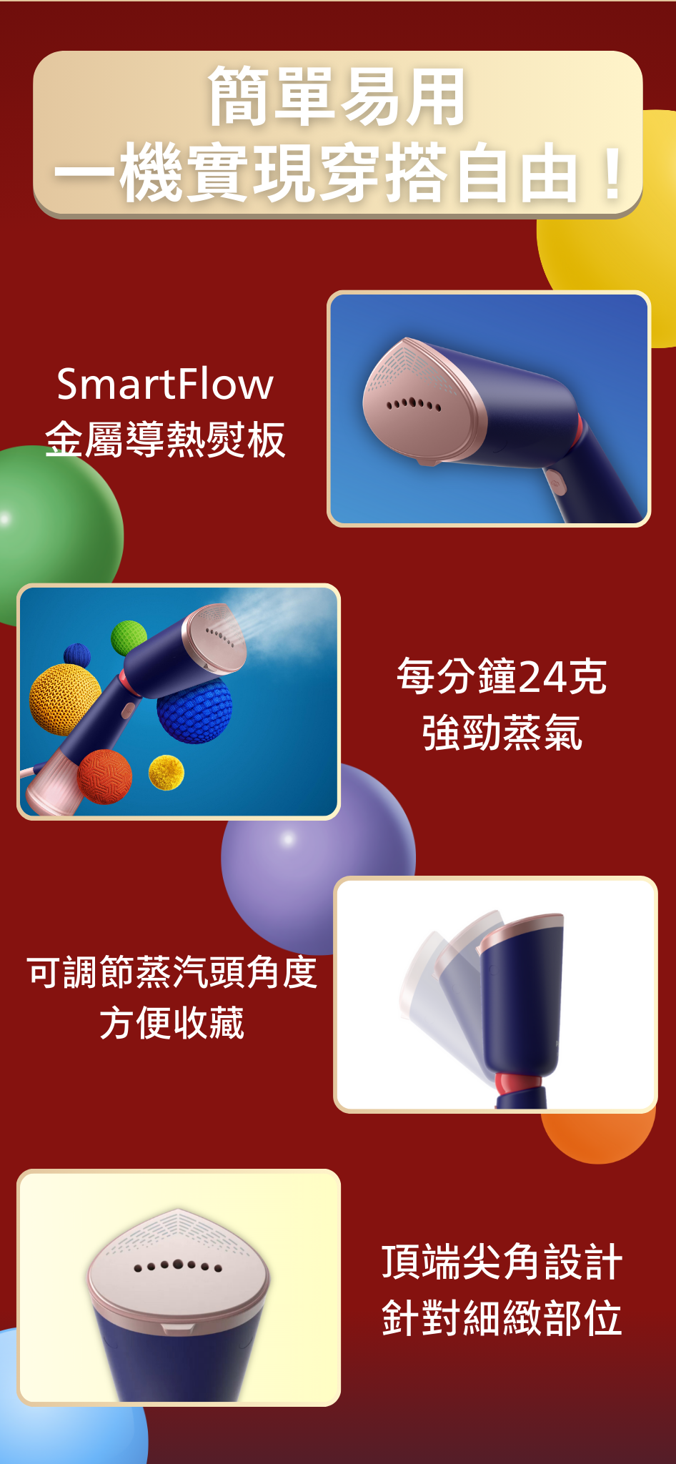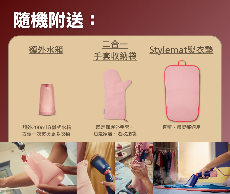 • 纖巧機身,可調校角度蒸氣噴頭,方便收藏和旅遊使用