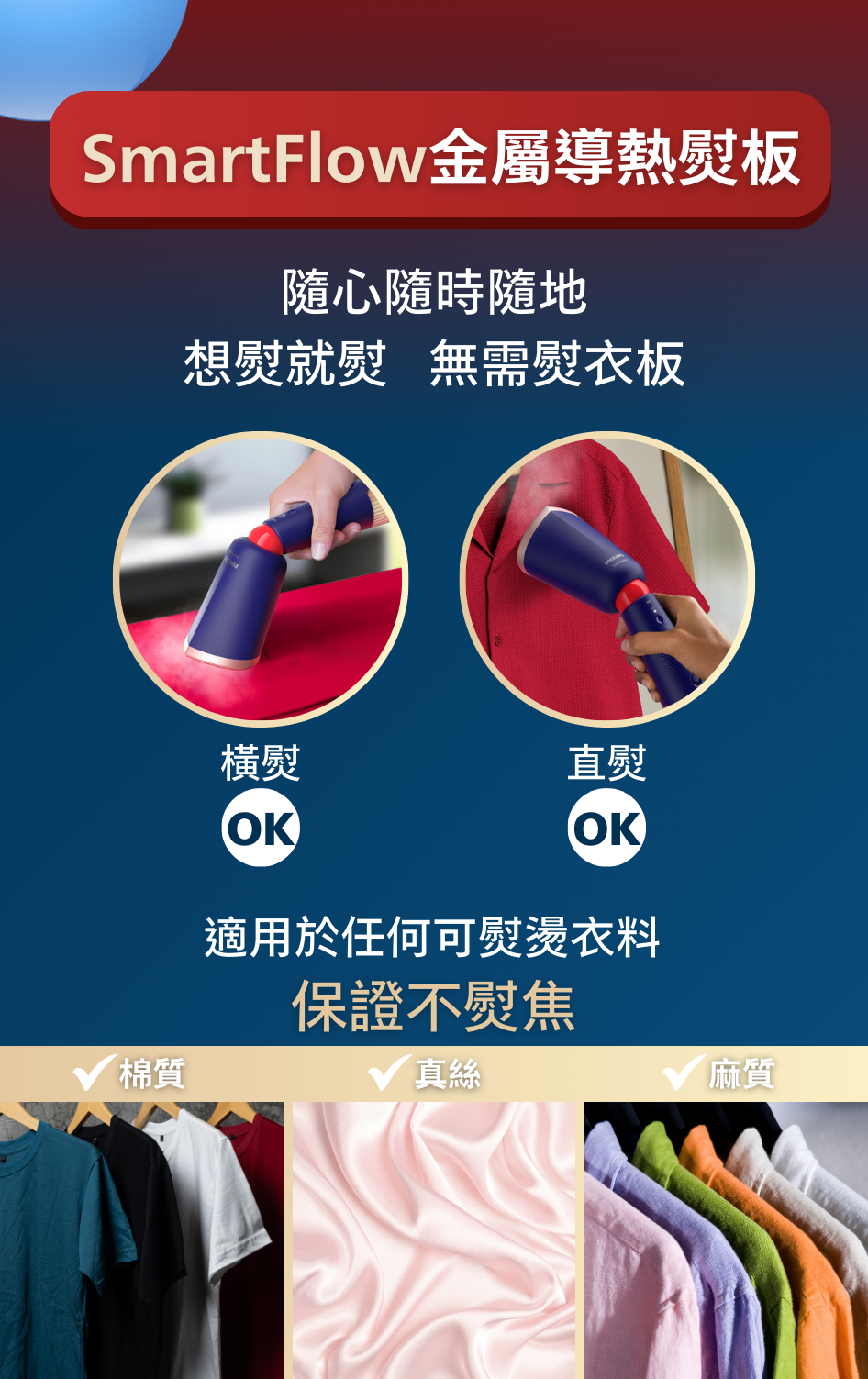 • SmartFlow 金屬導熱蒸氣燙壓板,適用於任何衣料,保證不熨焦