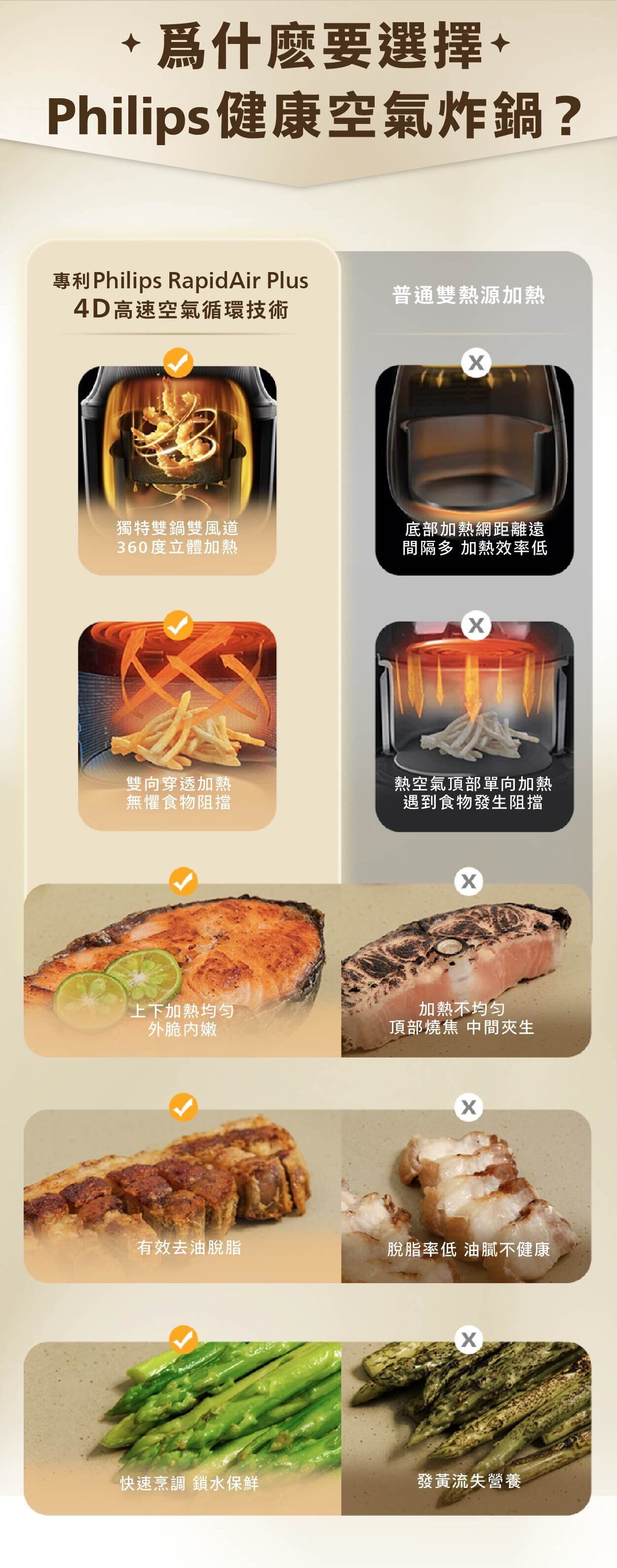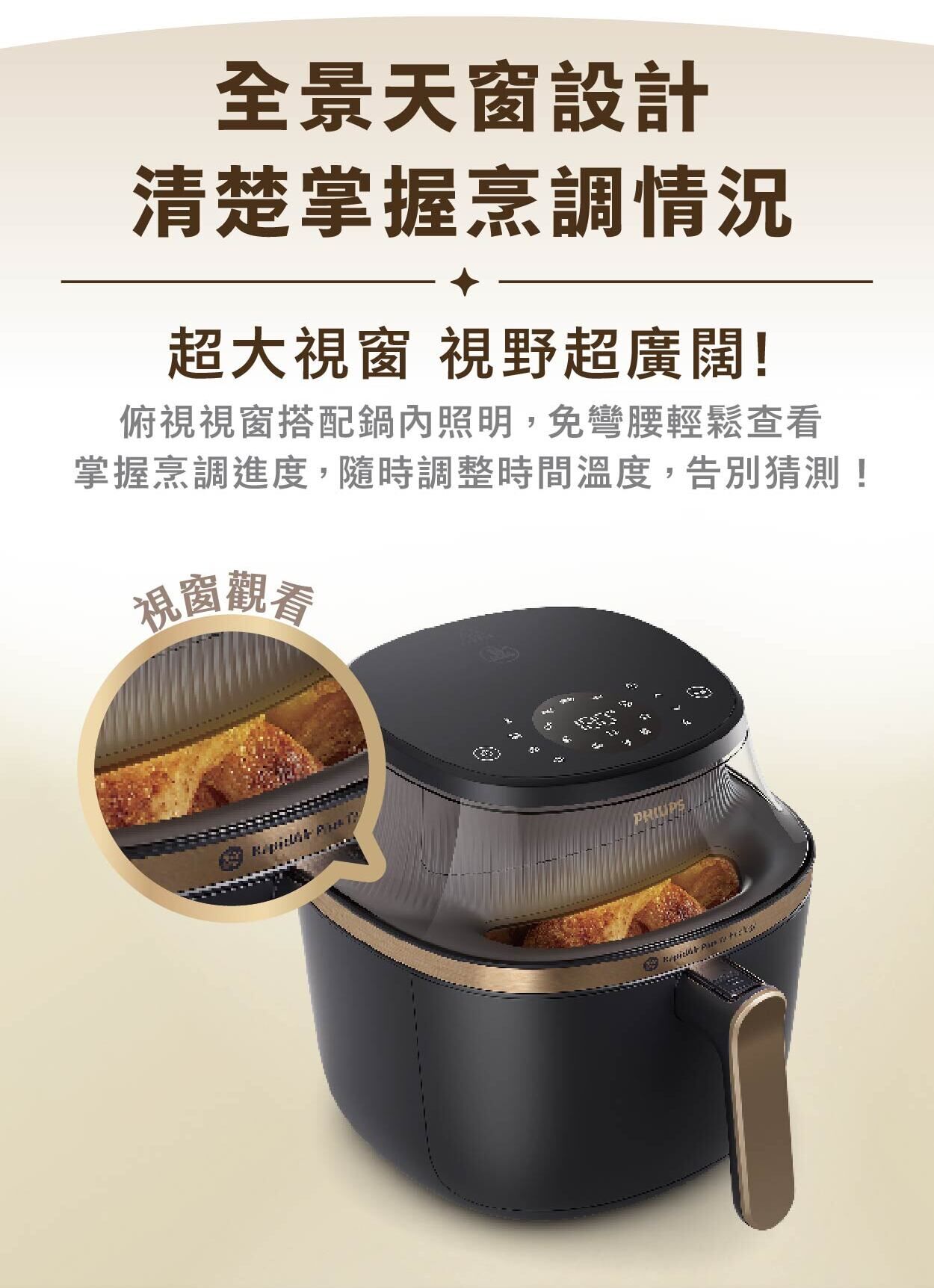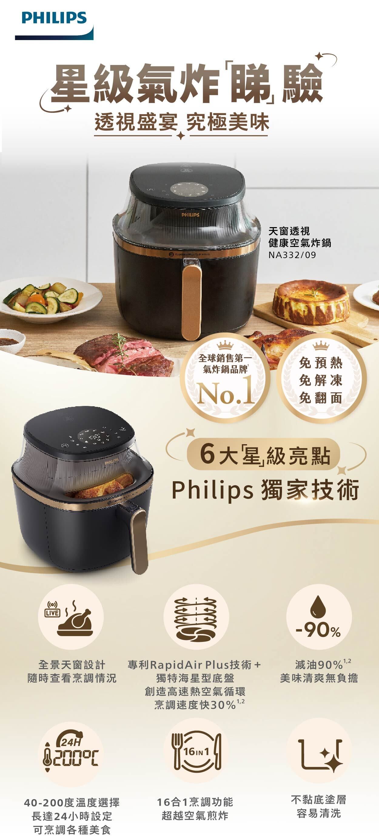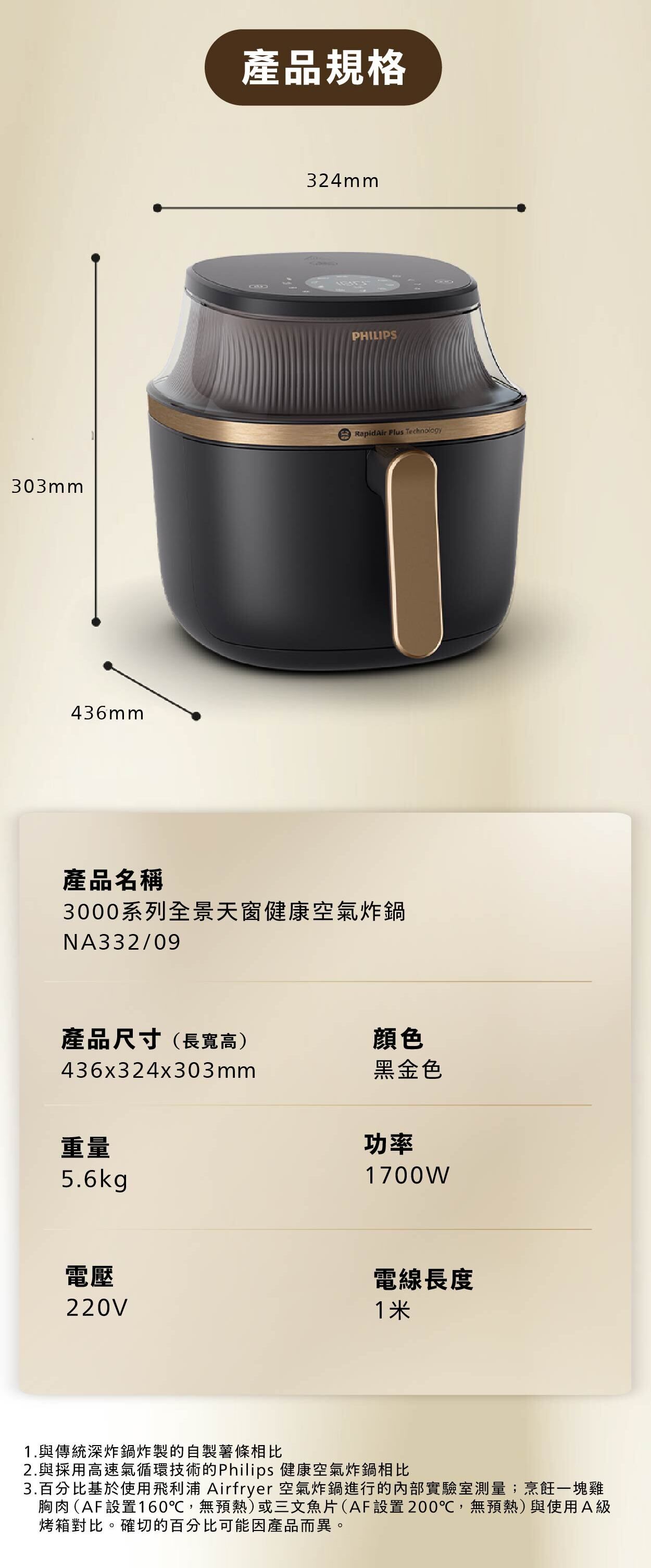 *與採用 RapidAir 高速空氣循環技術的Philips氣炸鍋相比,內部實驗室使用雞腿和薯條進行了測試。