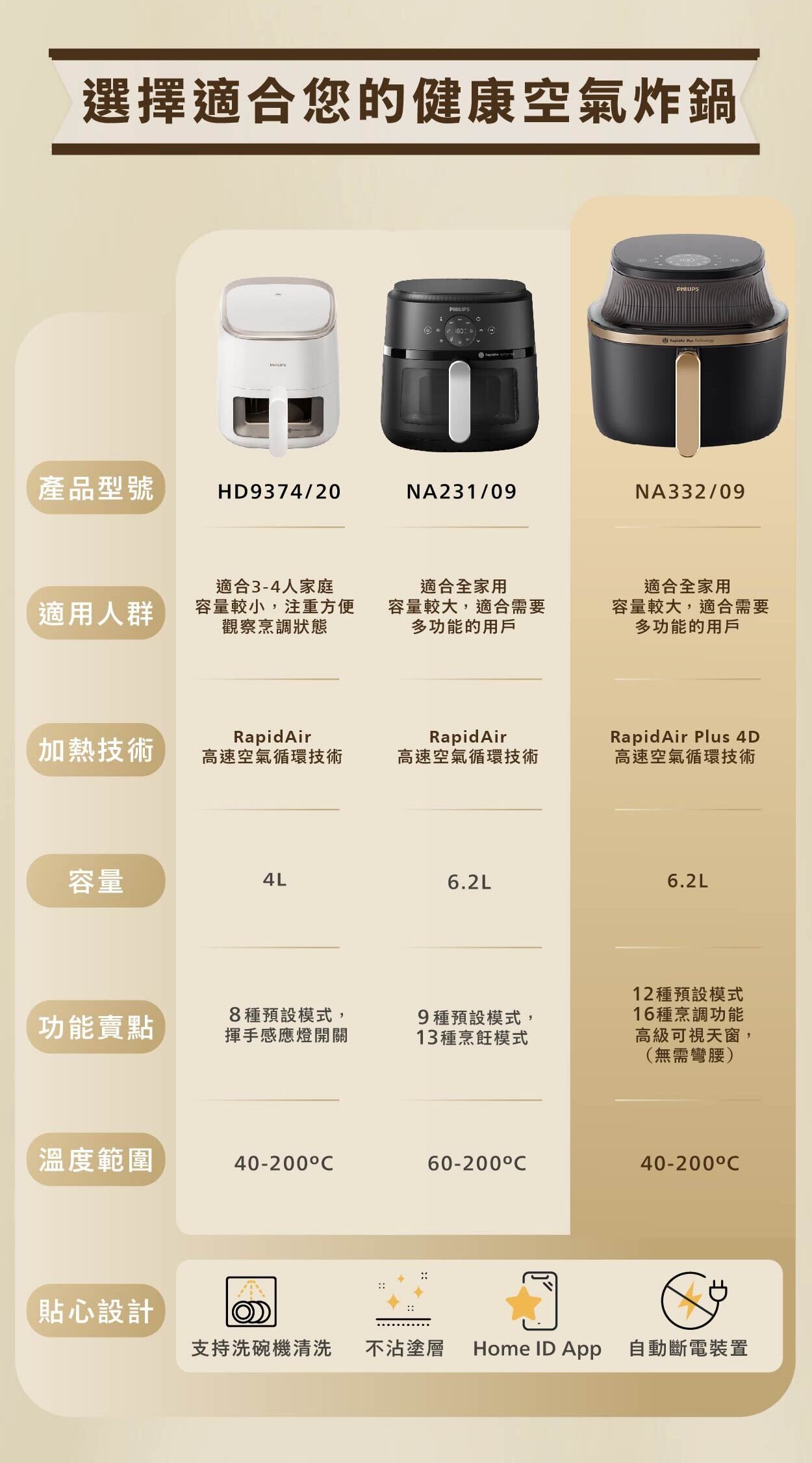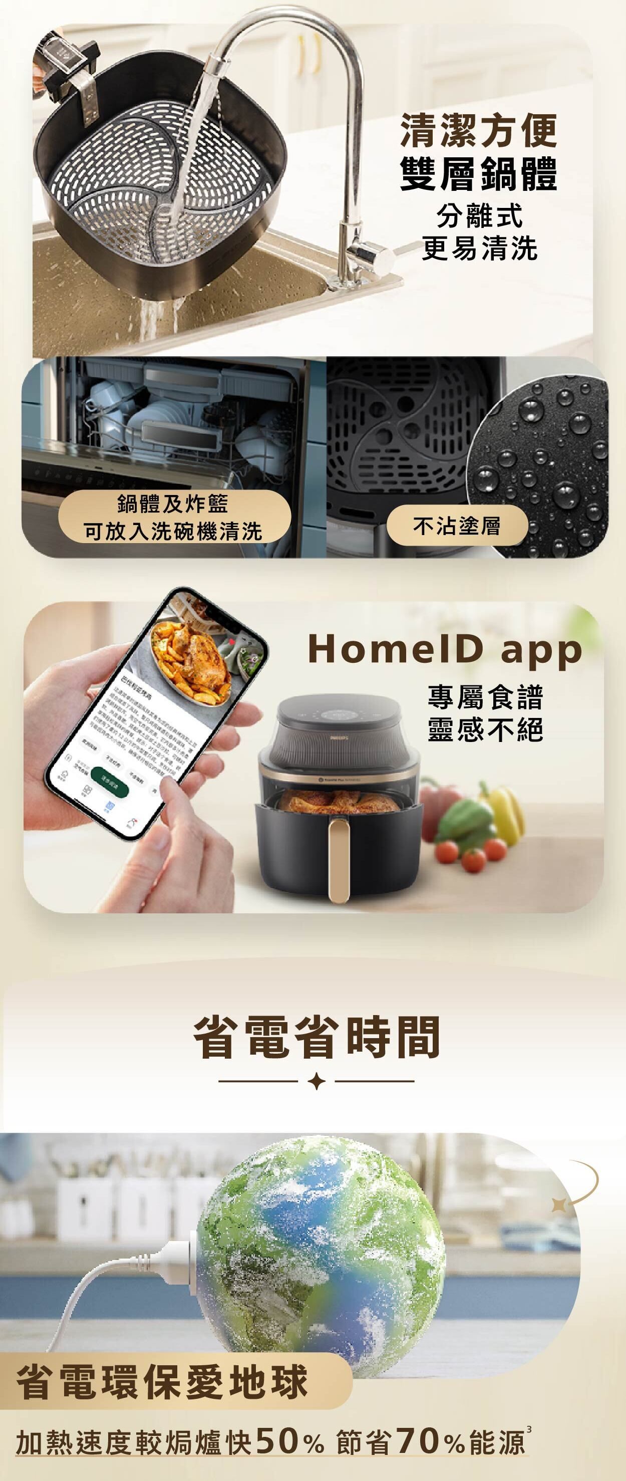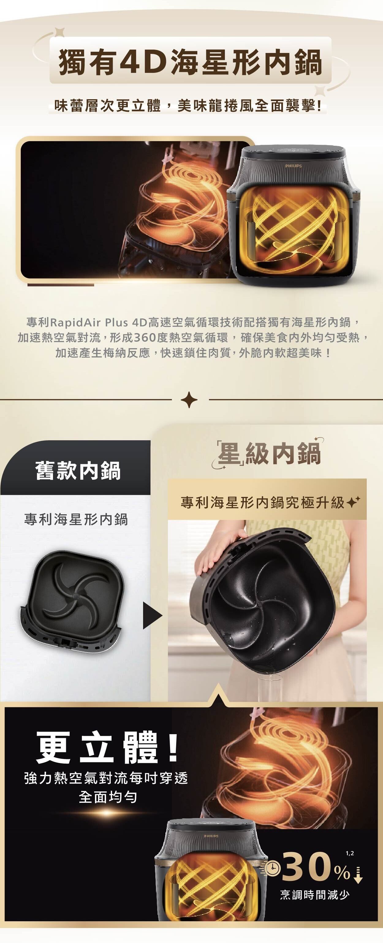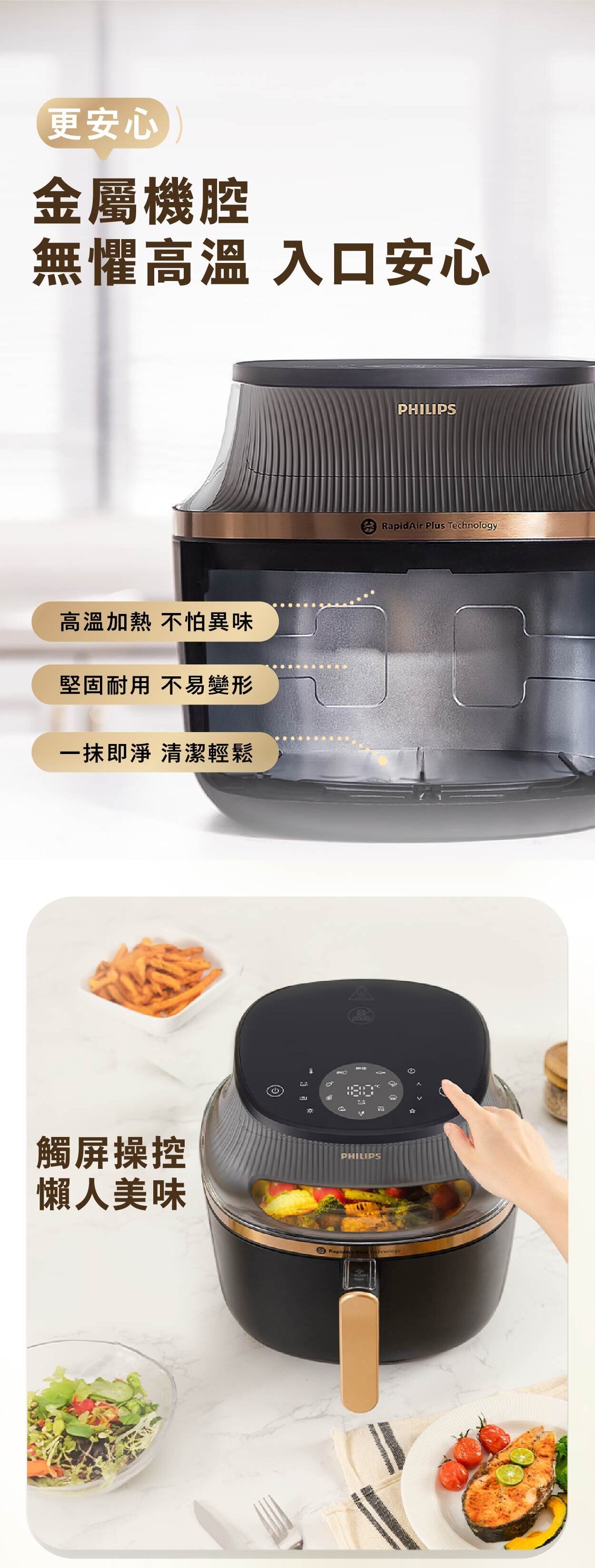 *與採用 RapidAir 高速空氣循環技術的Philips氣炸鍋相比,內部實驗室使用雞腿和薯條進行了測試。