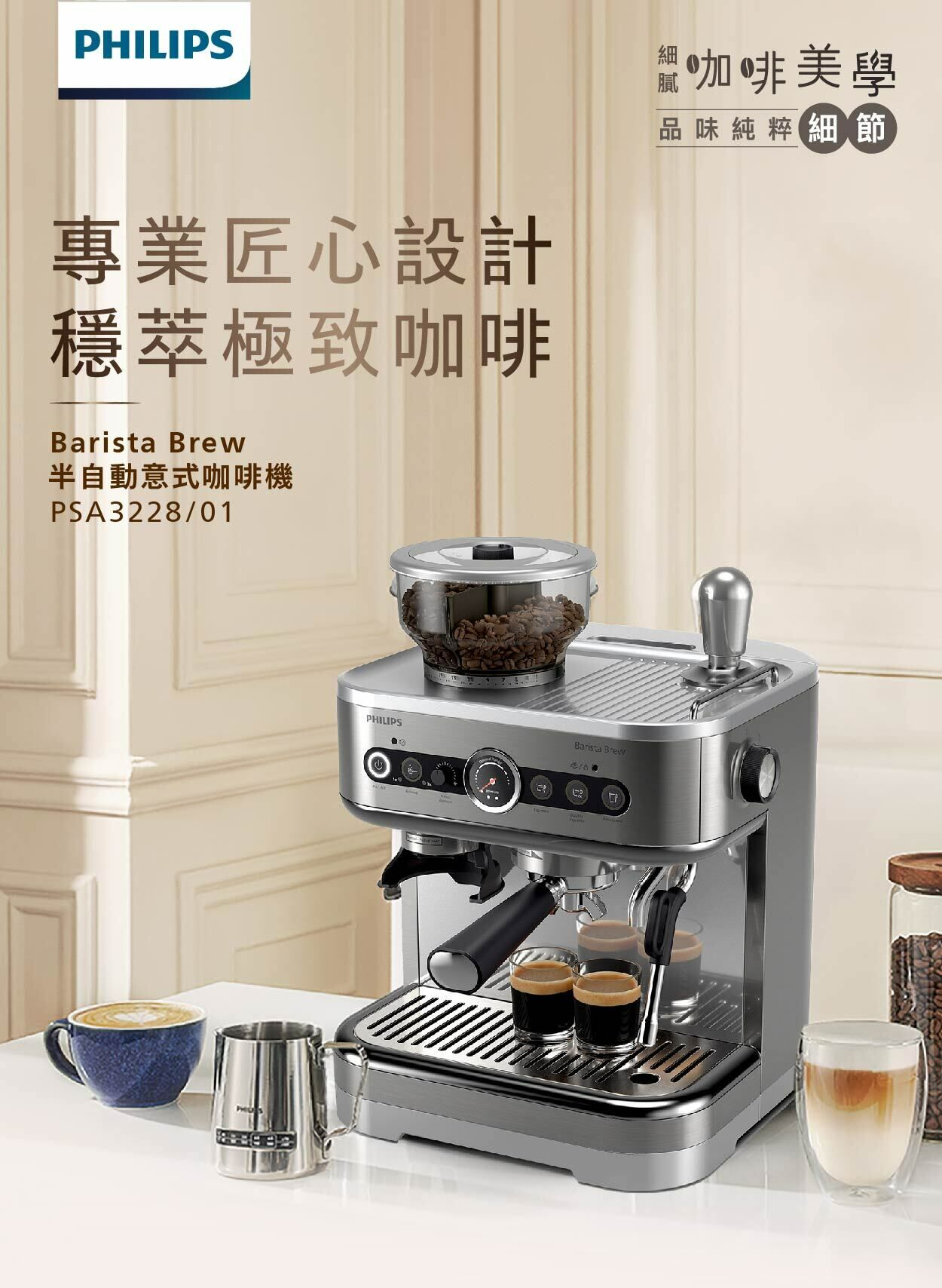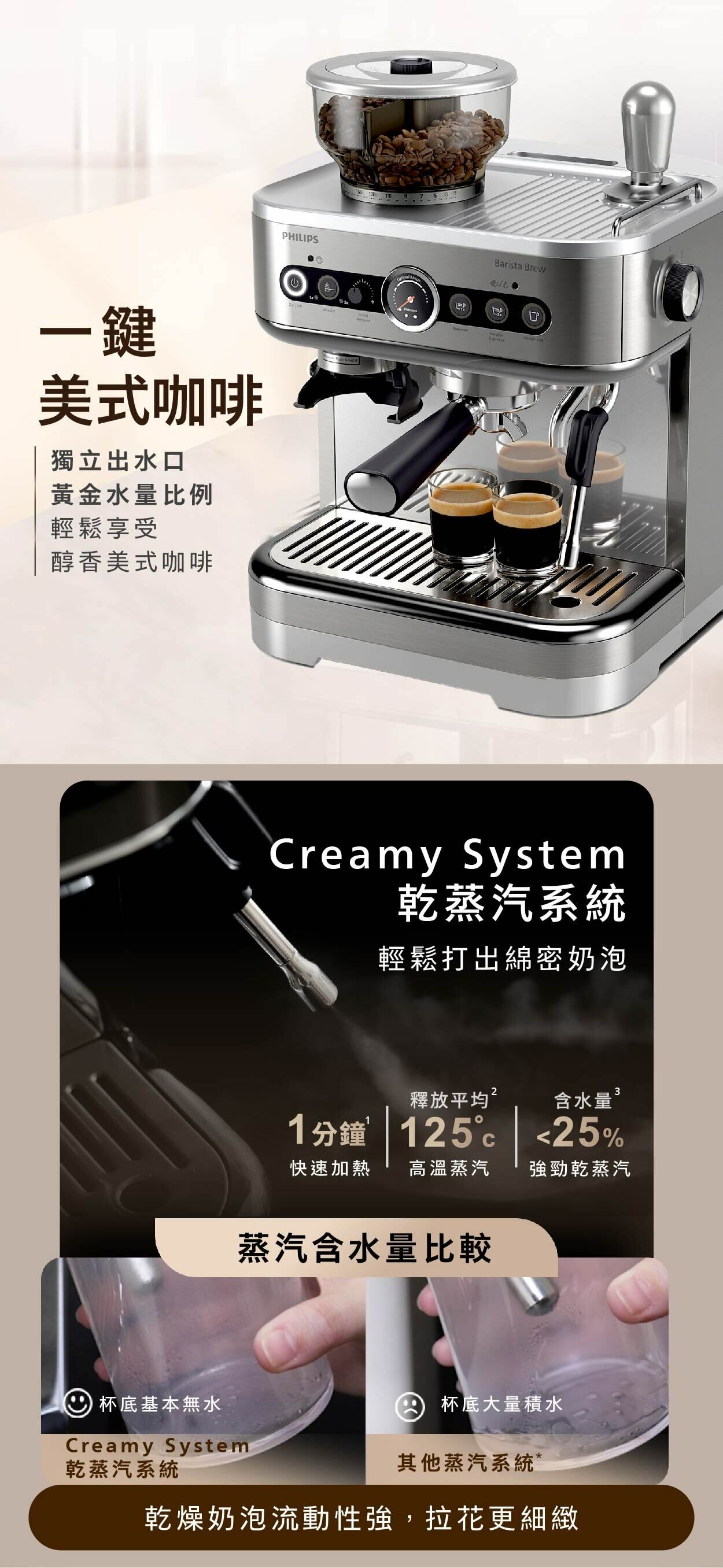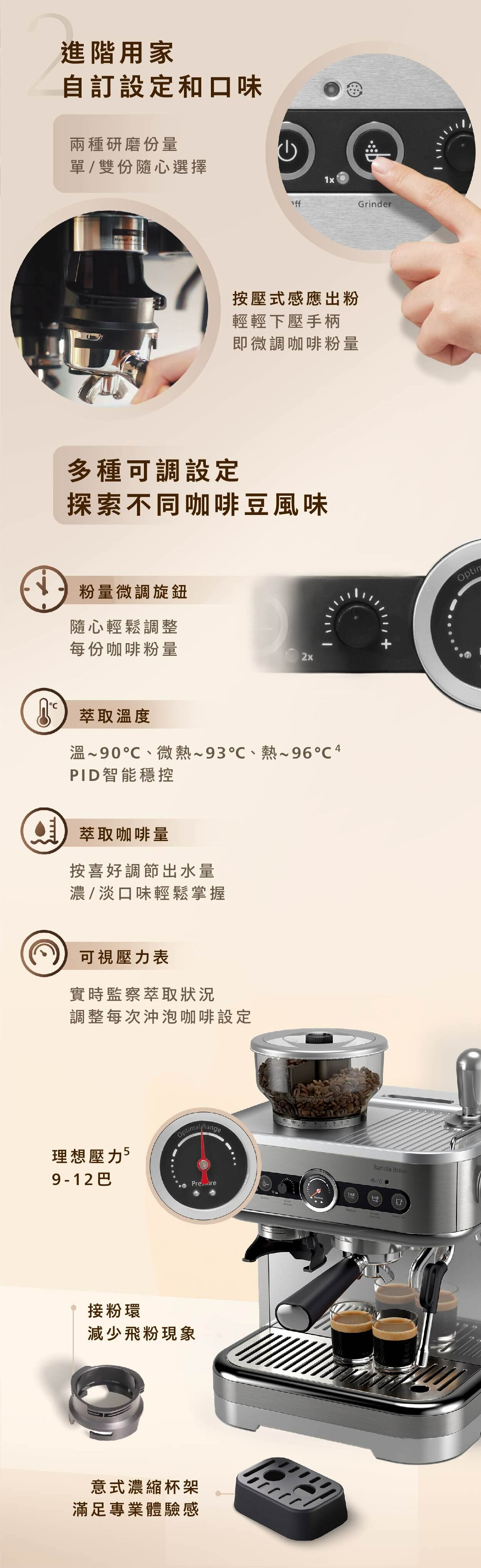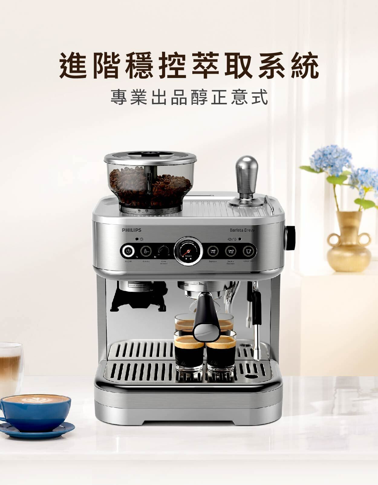 盡情享受新鮮特濃咖啡的濃郁香氣。使用 Philips Barista Brew 半自動意式咖啡機體驗自己製作咖啡的滿足感,旨在幫助真正的咖啡愛好者提升自己的沖泡咖啡的技能,享受製作每一杯咖啡的樂趣。