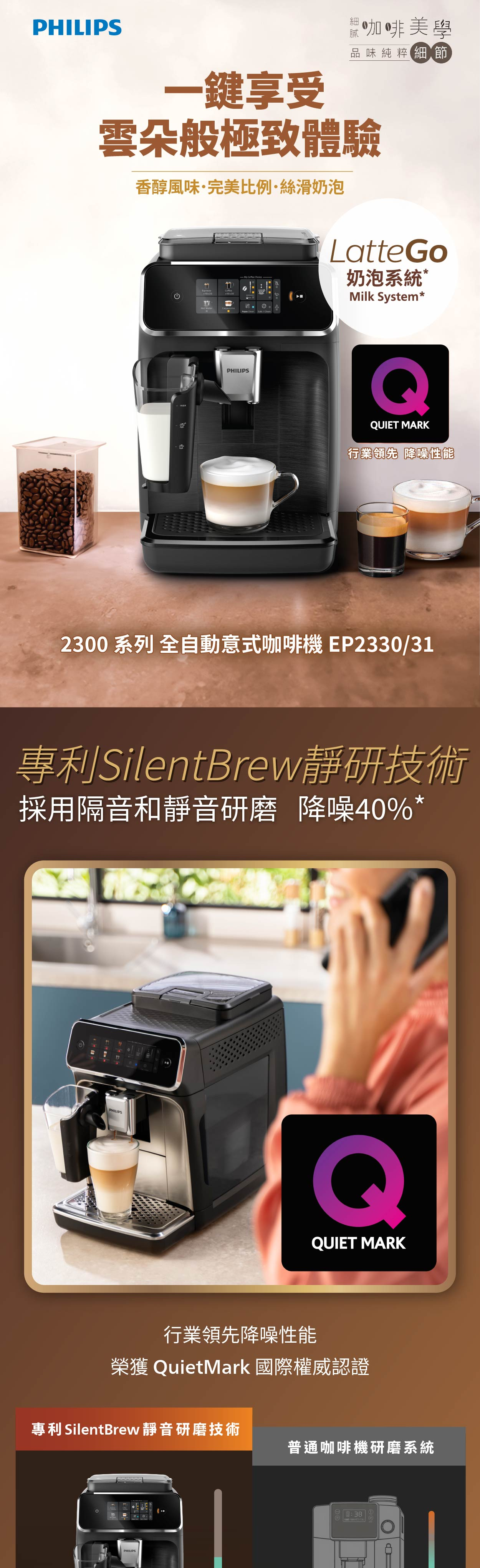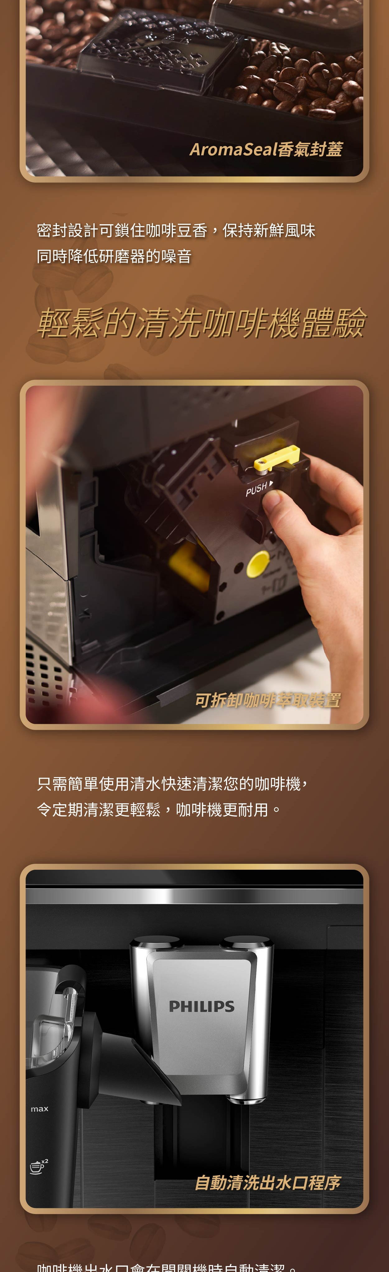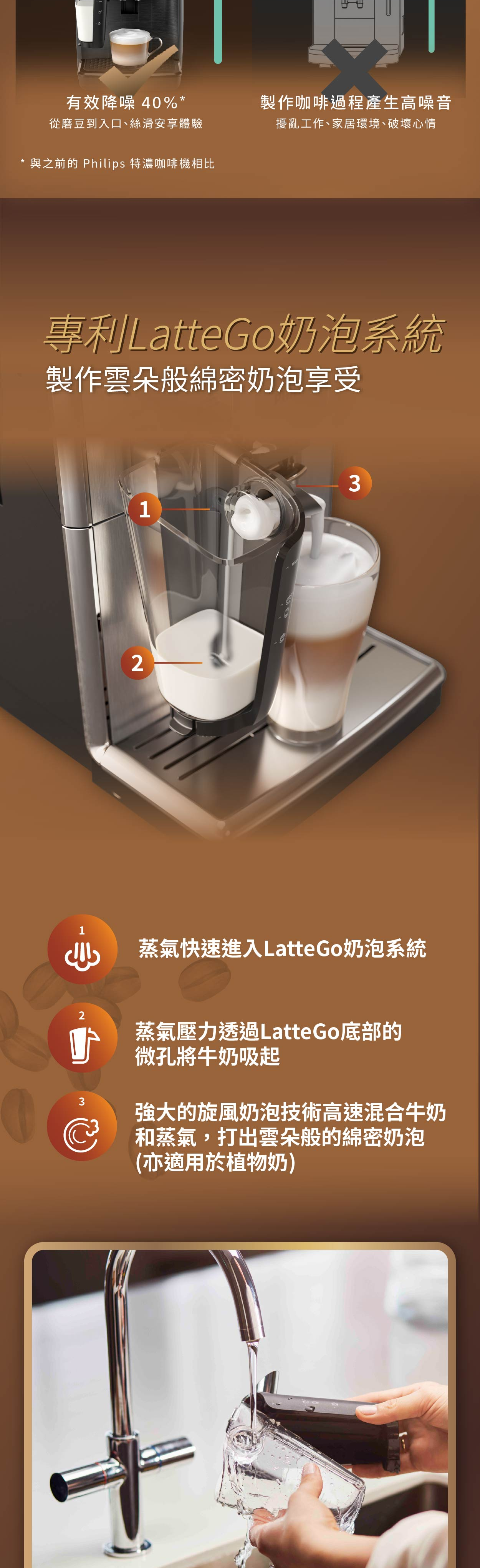 · LatteGo 奶泡系統: 強大的旋風奶泡技術,LatteGo自動為您的鮮奶咖啡製作出綿密絲滑的奶泡,彷如雲朵般的口感。無導管兩件式設計,只要輕鬆拆卸用清水10秒快速清潔, 配件可用洗碗機清洗,方便輕鬆
