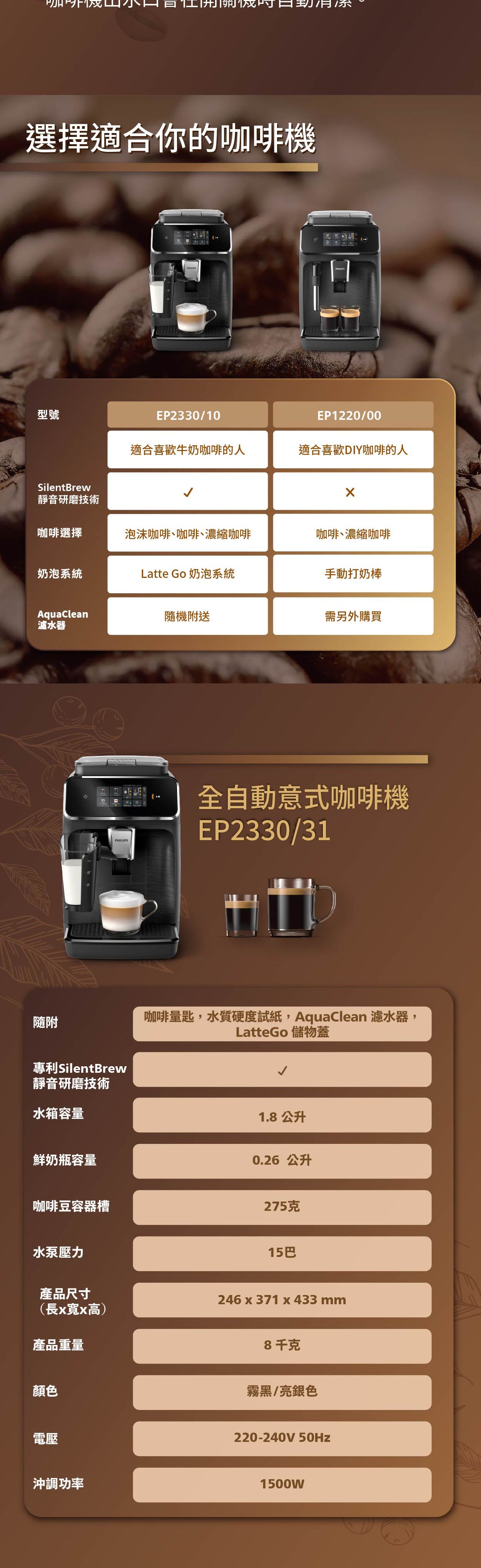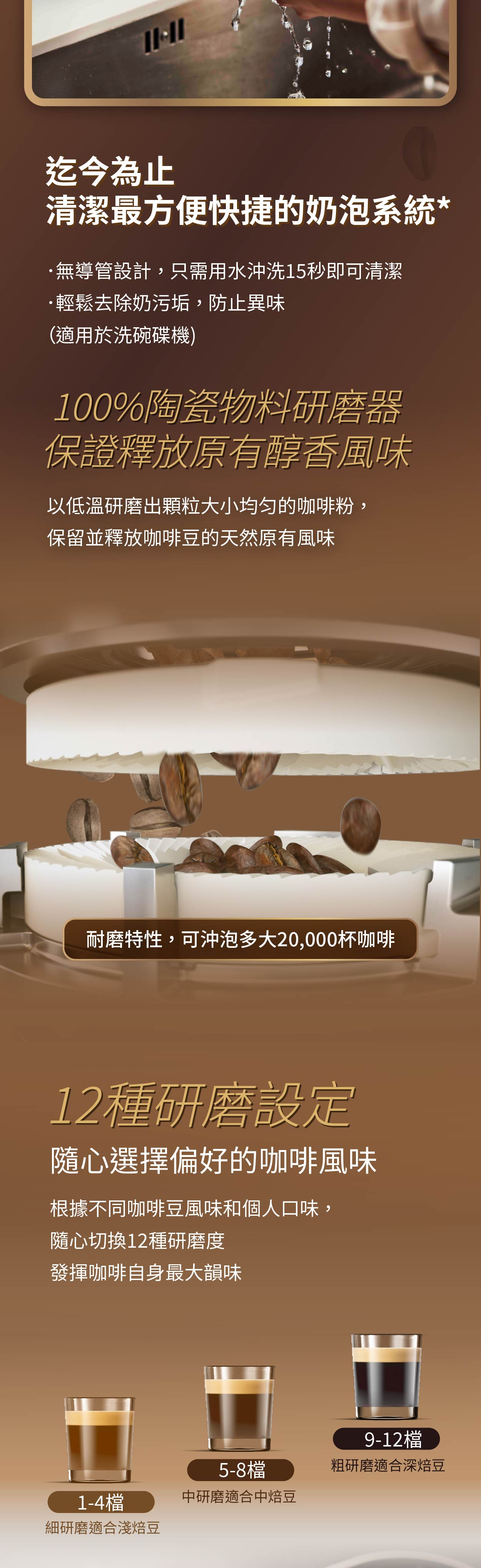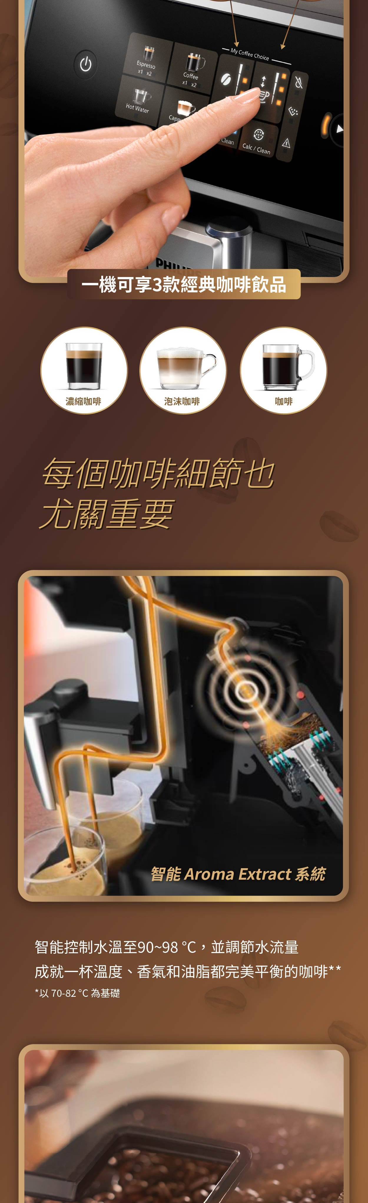 · LatteGo 奶泡系統: 強大的旋風奶泡技術,LatteGo自動為您的鮮奶咖啡製作出綿密絲滑的奶泡,彷如雲朵般的口感。無導管兩件式設計,只要輕鬆拆卸用清水10秒快速清潔, 配件可用洗碗機清洗,方便輕鬆