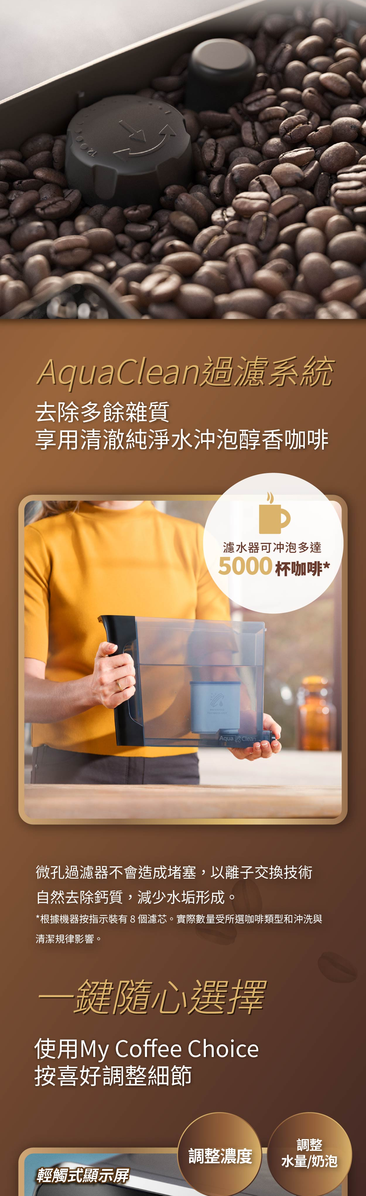· AquaClean 濾水器: 按照咖啡機的提示更換濾水器,您可以在無需為咖啡機除垢的情況下最多沖泡 5000 杯咖啡**,同時享受清澈的純淨水