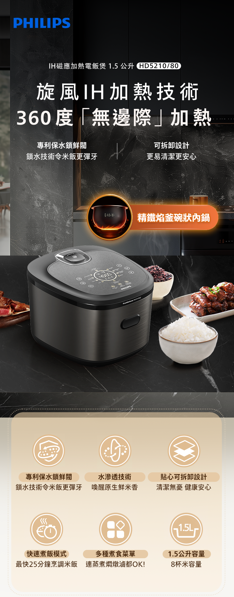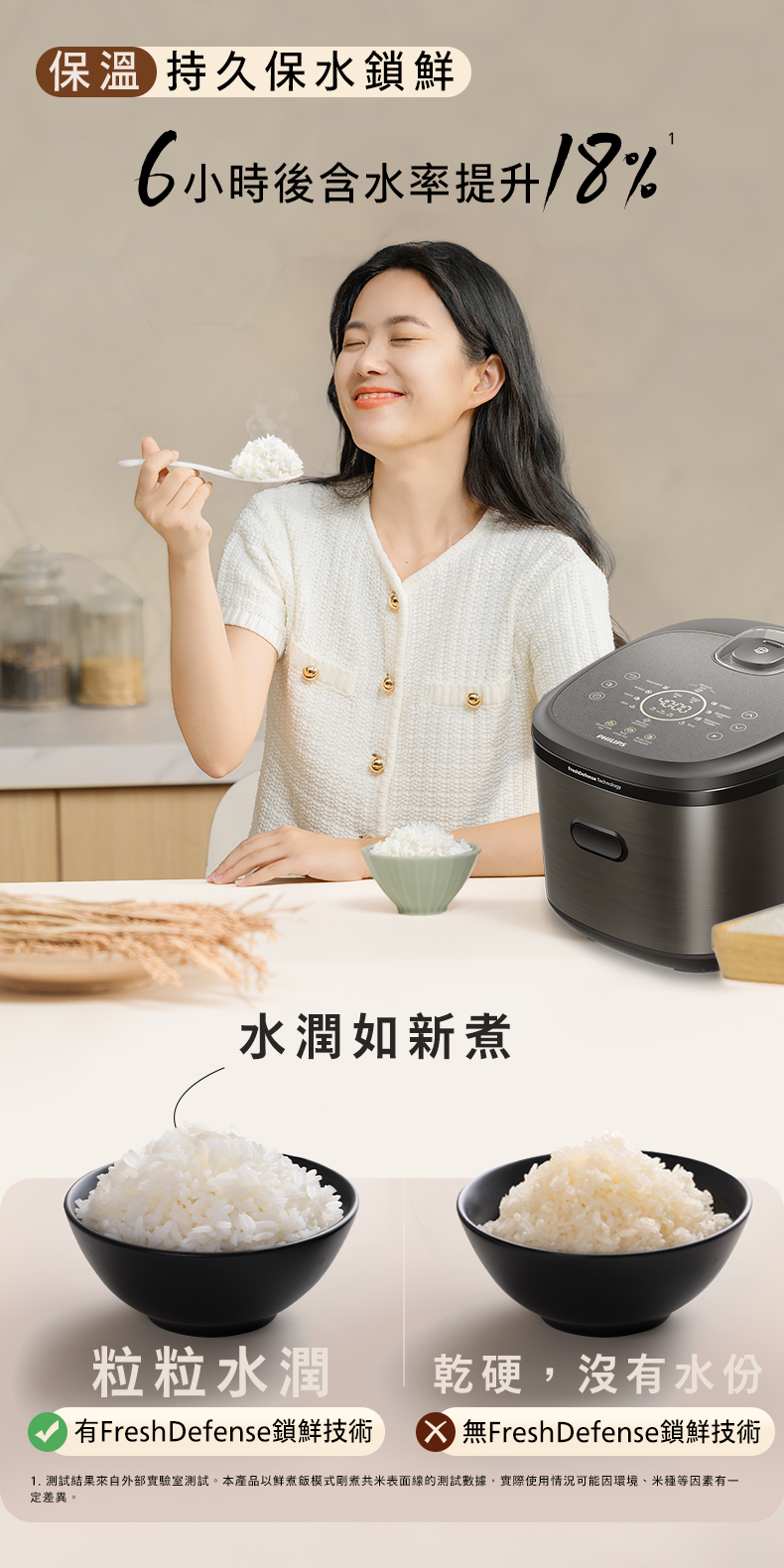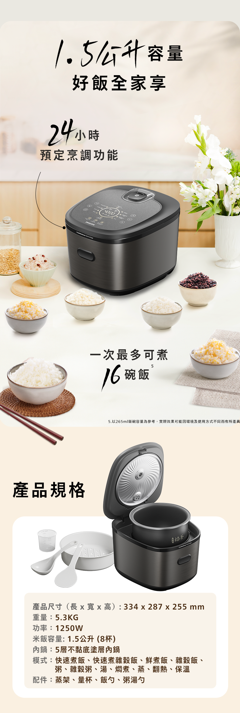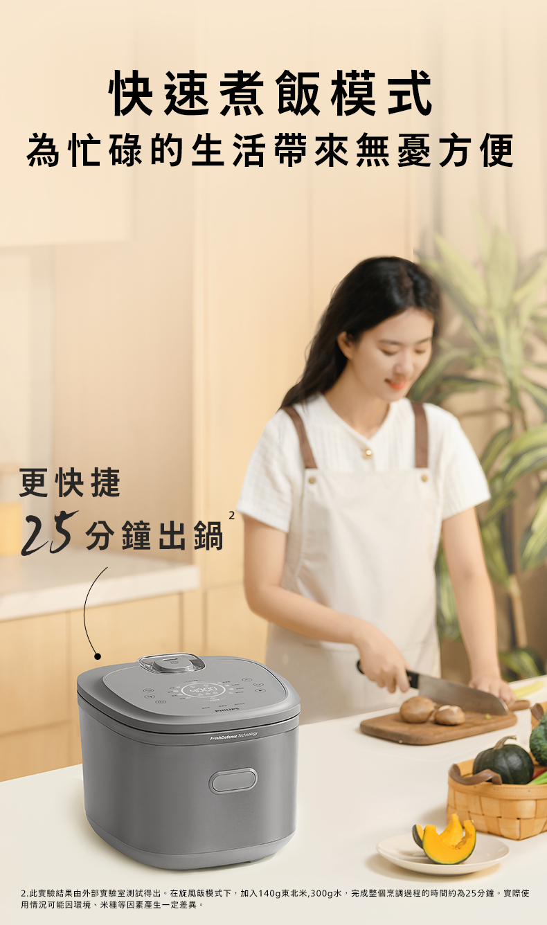 ** 經飛利浦授權的外部實驗室測試。使用快速煮飯程式,140g東北米,300g水,平均需要25分鐘。實際使用情況可能因環境、米種等因素而有所不同