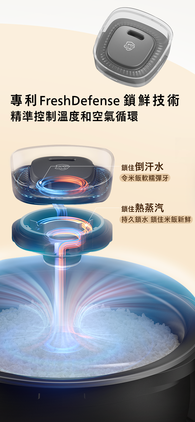 • 創新的FreshDefense鎖鮮技術,採用專門設計的雙通道蒸汽閥,透過精確控制溫度和空氣循環來鎖住多餘的水分,從而鎖定完美的水分水平,使米飯長時間保持新鮮鬆軟