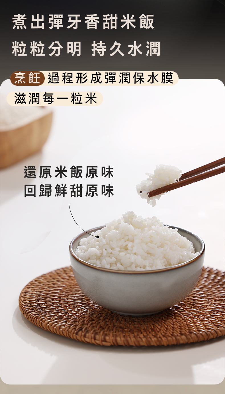 具有出色的鎖水技術,讓你能嚐到持久新鮮和鬆軟的米飯,並享受快速烹煮美味可口的雜穀飯,無需提前浸泡。
