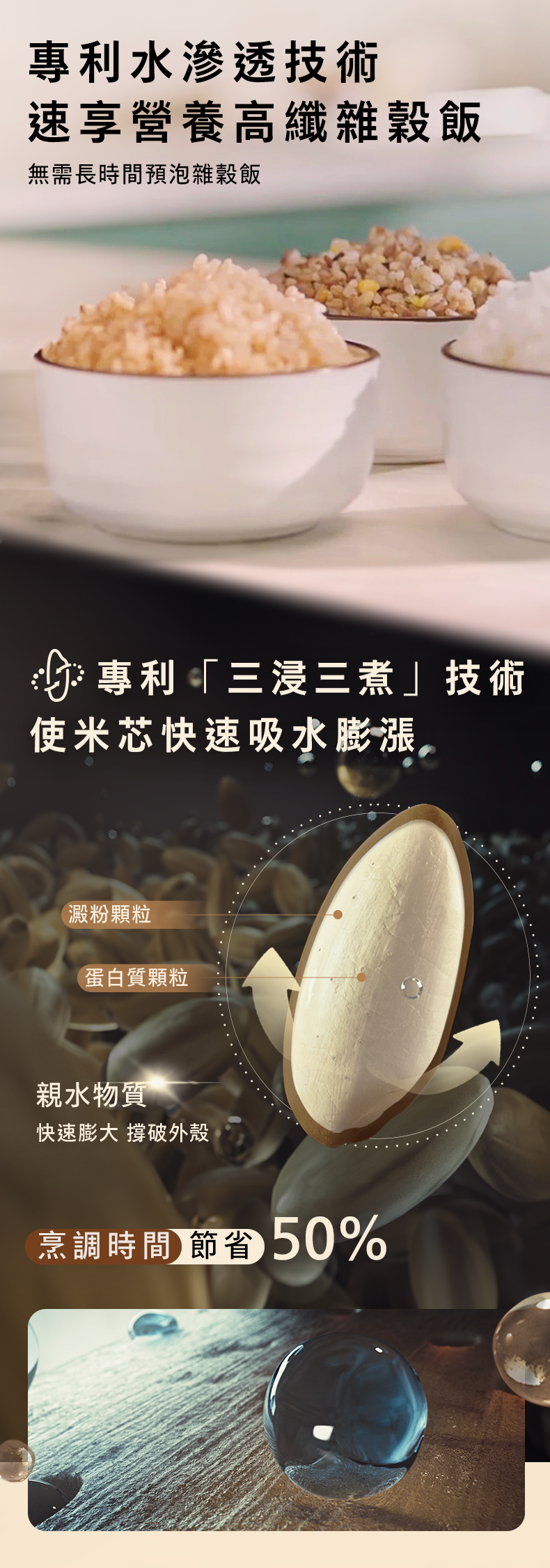 • 專研的水滲透技術,模擬自然,為穀物提供最佳的吸水條件,加速穀殼裂開。此技術可使水快速滲透到每顆穀物的中心,只需 40 分鐘即可煮熟並釋放出雜穀米飯的香味*