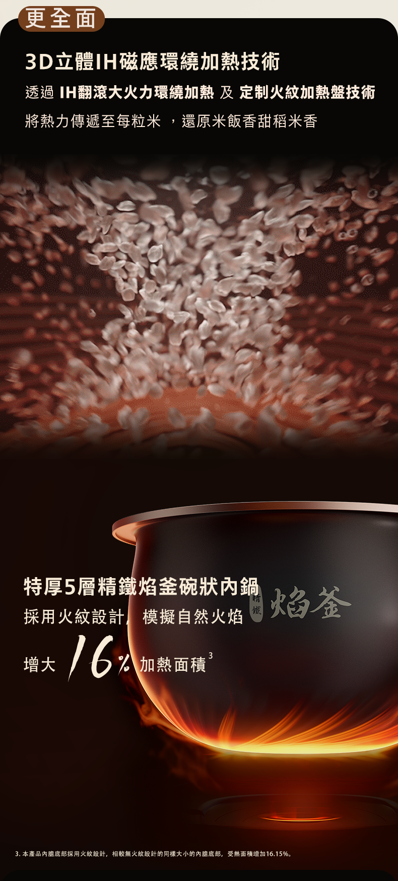 • 精鐵焰釜碗狀內鍋採用火紋設計,增加加熱面積,結合3D IH磁應環繞加熱系統,有助於將更多熱量傳遞至米芯,激發米飯香氣