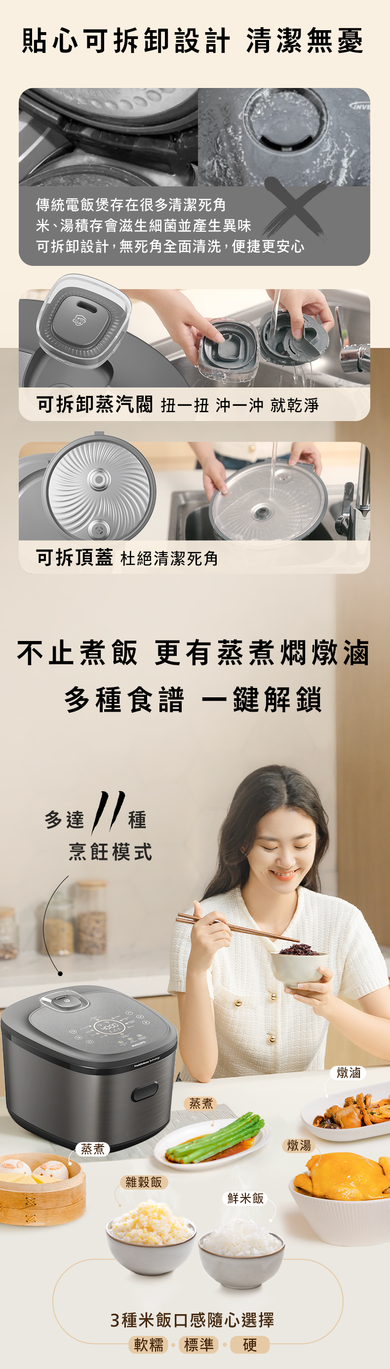 鮮煮飯、雜穀飯、粥、雜穀粥、湯、燜煮、蒸、翻熱、保溫