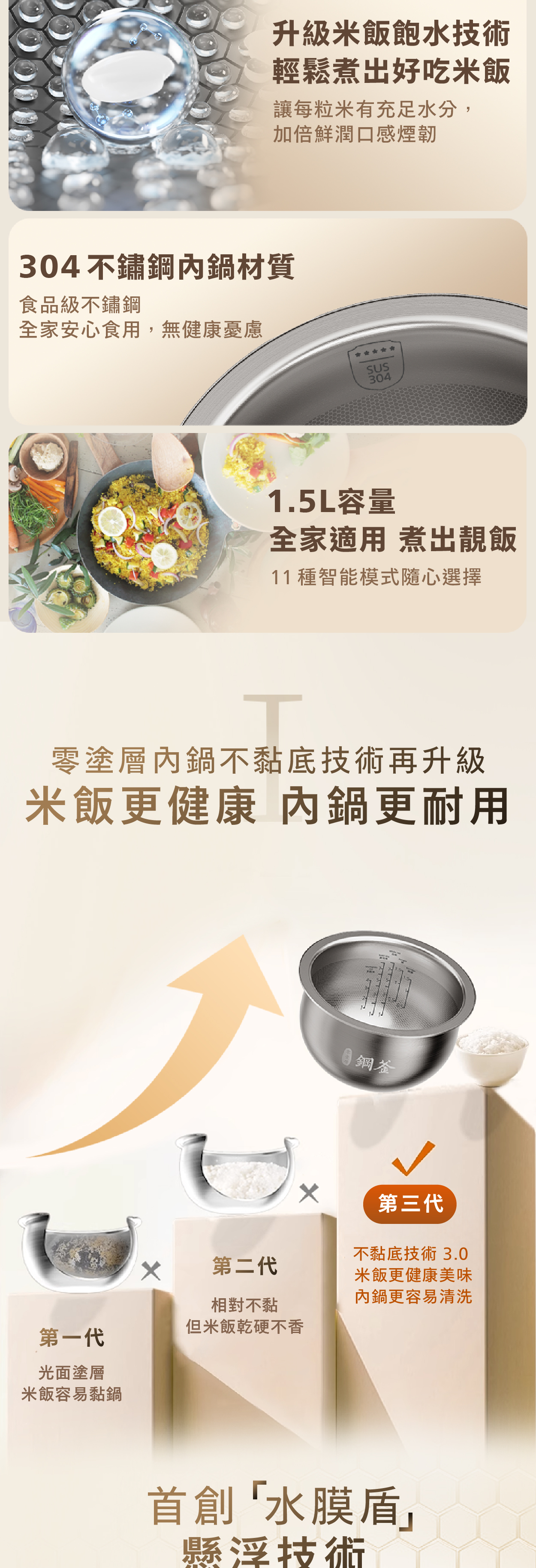 Philips創新零塗層電飯煲,輕鬆煮出健康好飯,採用食品級304不鏽鋼內膽,無塗層設計更健康、更耐用。「水膜盾」技術減少米飯黏底,升級「鮮潤面膜飯 2.0」技術配搭「保水鎖鮮閥」專利鎖住水分,米飯柔軟香甜,即使放置6小時仍保持水潤口感。智能晶片穩控煮飯品質,內置11種烹調功能滿足全家需求,煮飯更便捷。