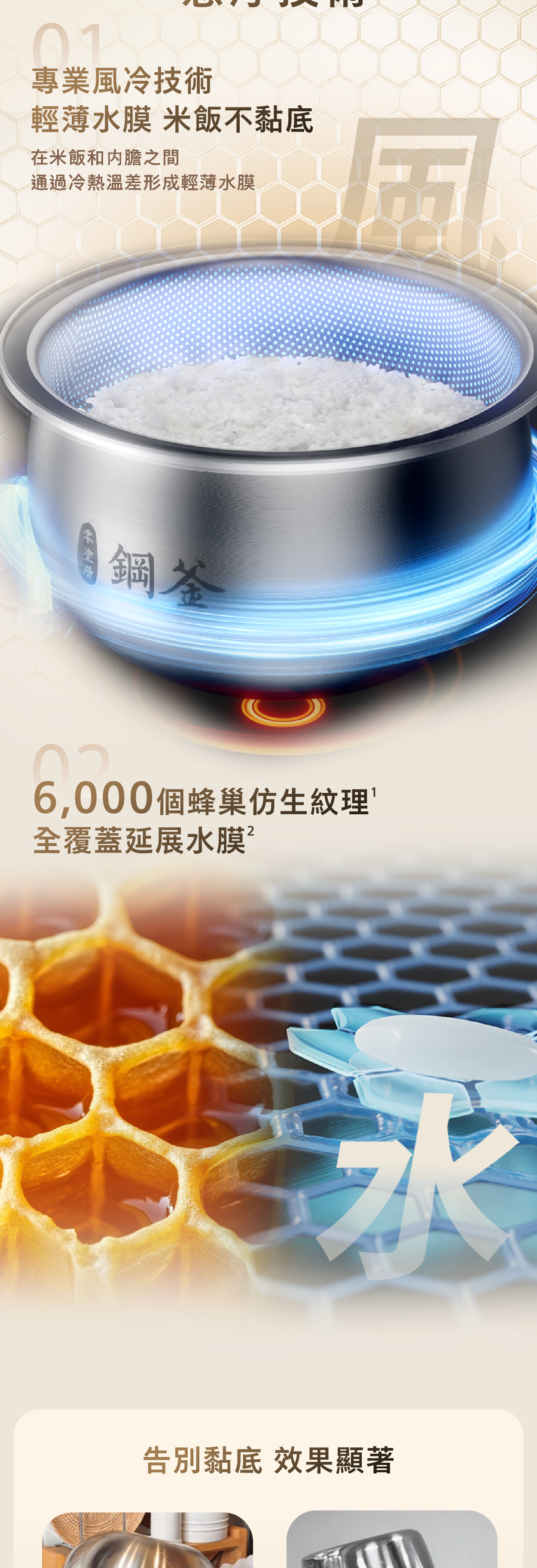 Philips首創「微弧水膜盾紋理」,超過6000個*微結構築成水膜懸浮層,在煮飯時形成天然懸浮水膜,有效防止黏底