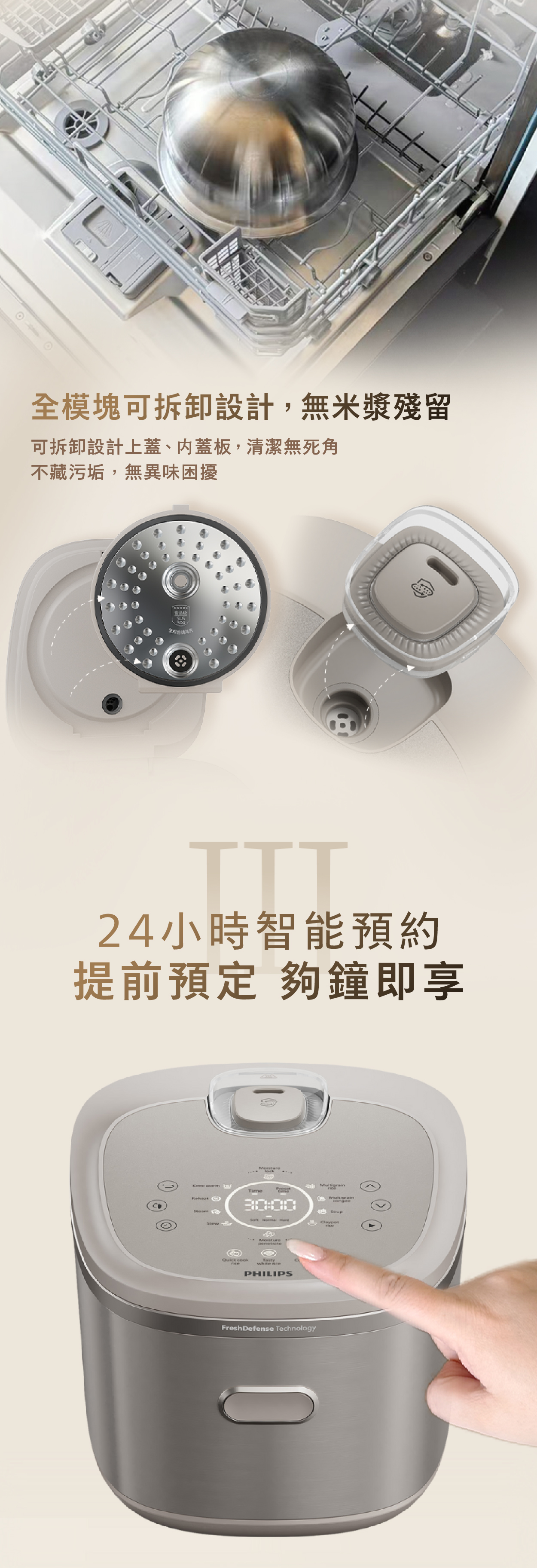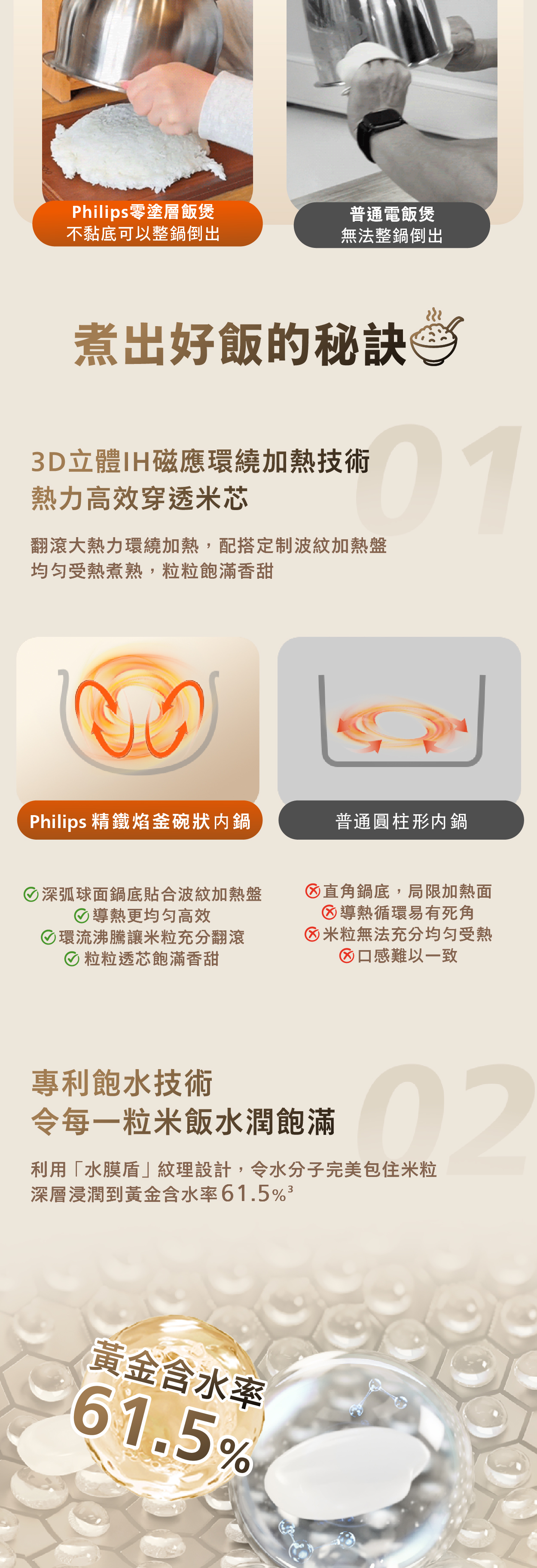 Philips專利「水膜煮飯模式」,使水分均勻包覆每粒米,滲透至米芯,鎖水保濕,改善飯質干硬問題
