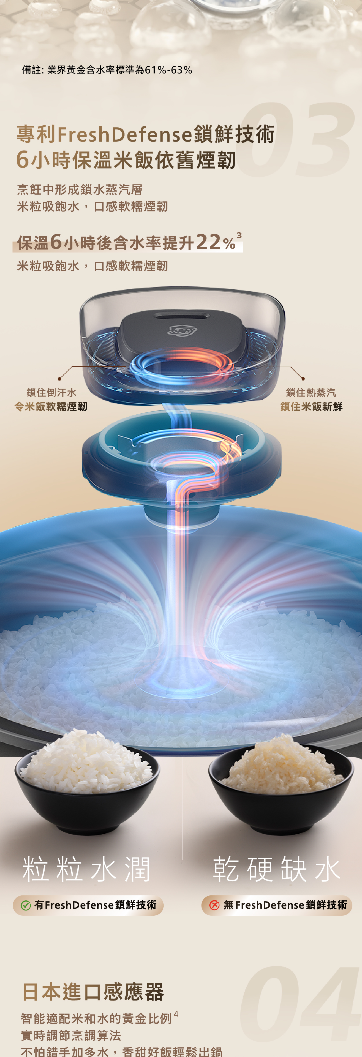 專利「保水鎖鮮閥」提升內膽濕度,有效鎖住含水率,即使放置6小時亦保持米飯口感