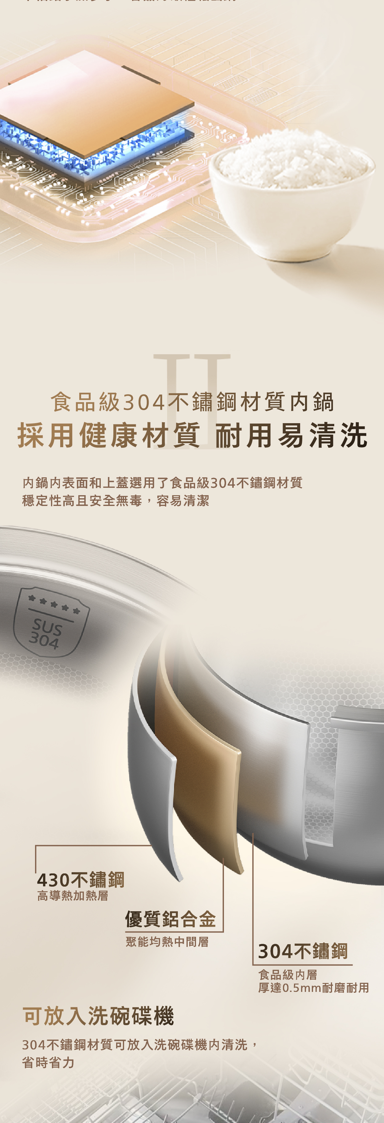 無需任何塗層物料,即可達致超不黏效果,內膽及上蓋全機以食品級304不鏽鋼製成,更健康、更耐用