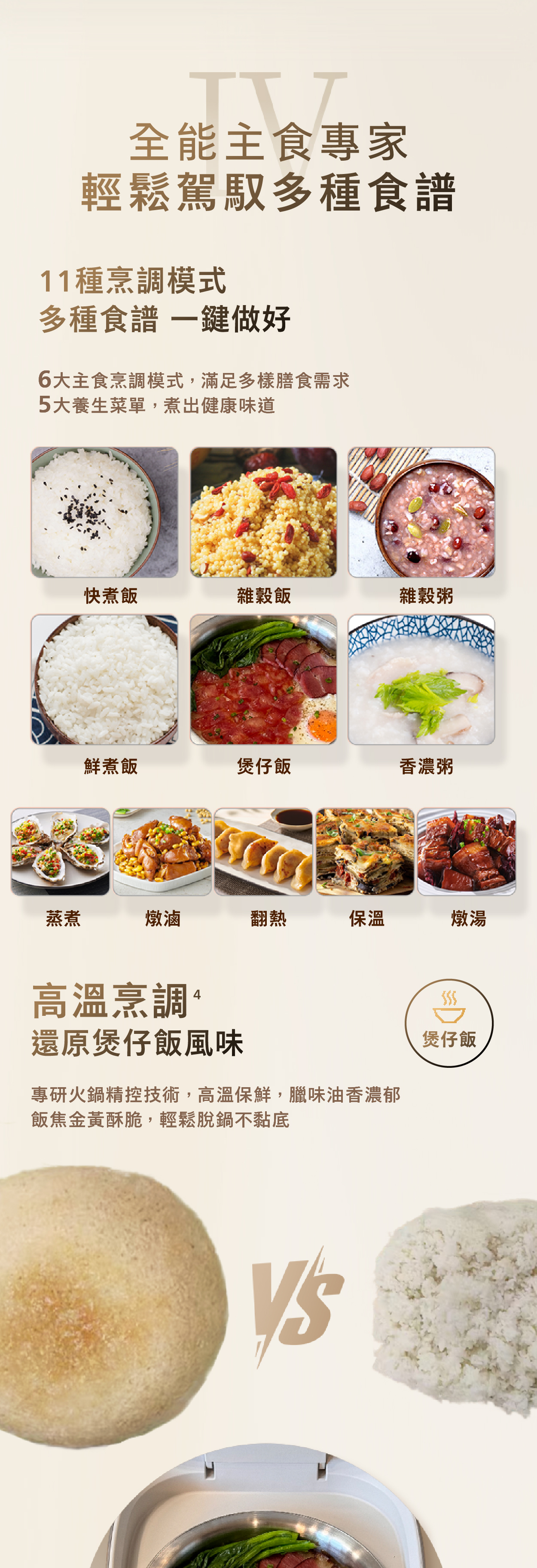 特設「黃金煲仔飯」模式,模擬柴火效果,煮出飯焦香脆,輕鬆脫鍋不黏底