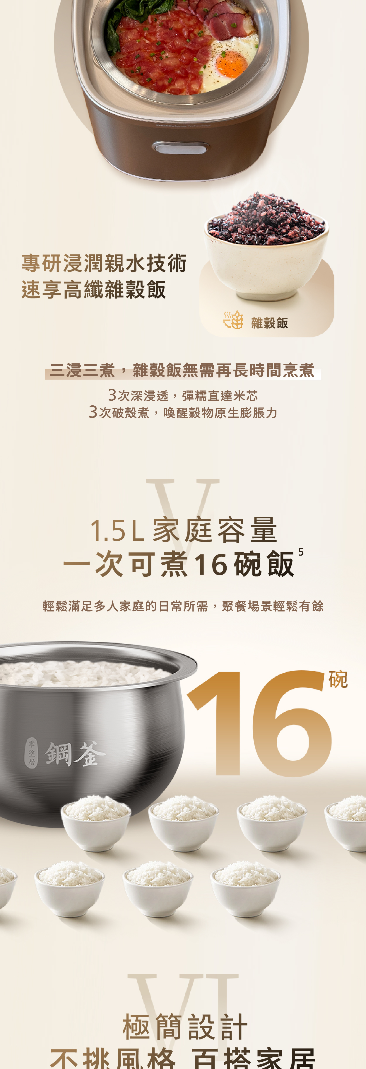 內建 6 大煮飯選項:白米、快炊、煮粥、煲仔飯、糙米飯、五穀粥