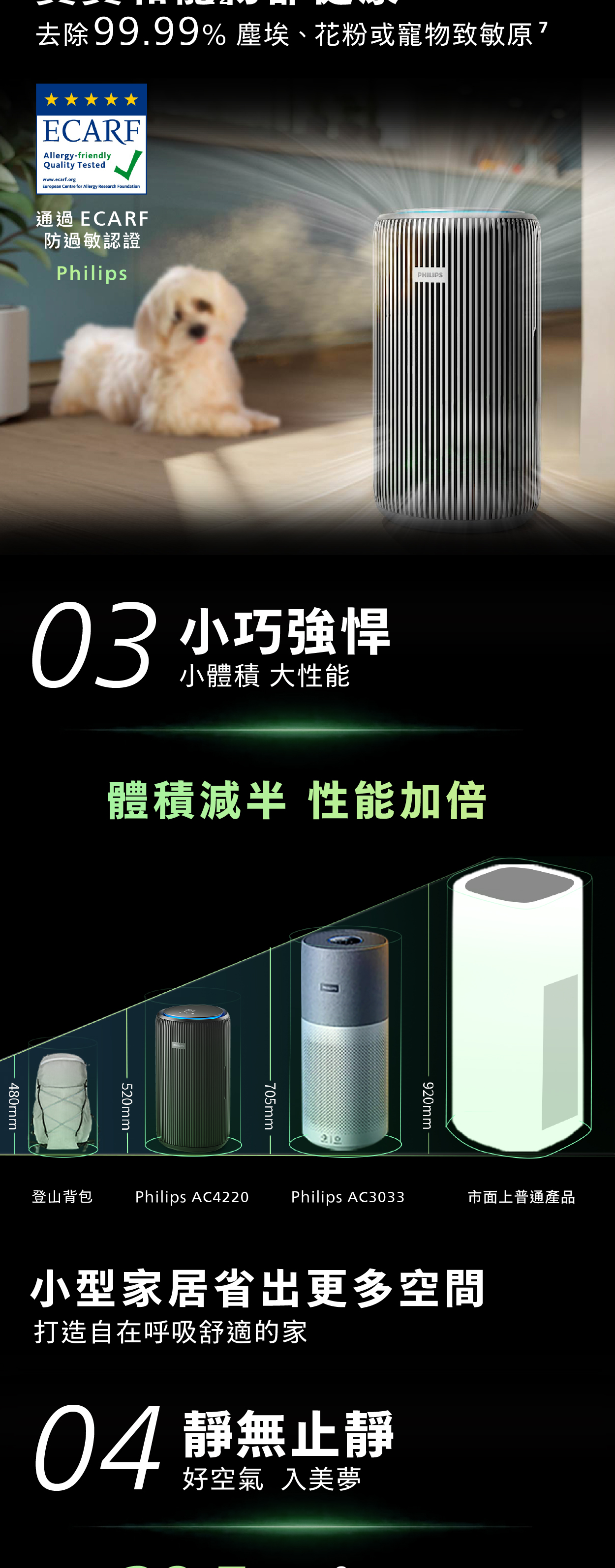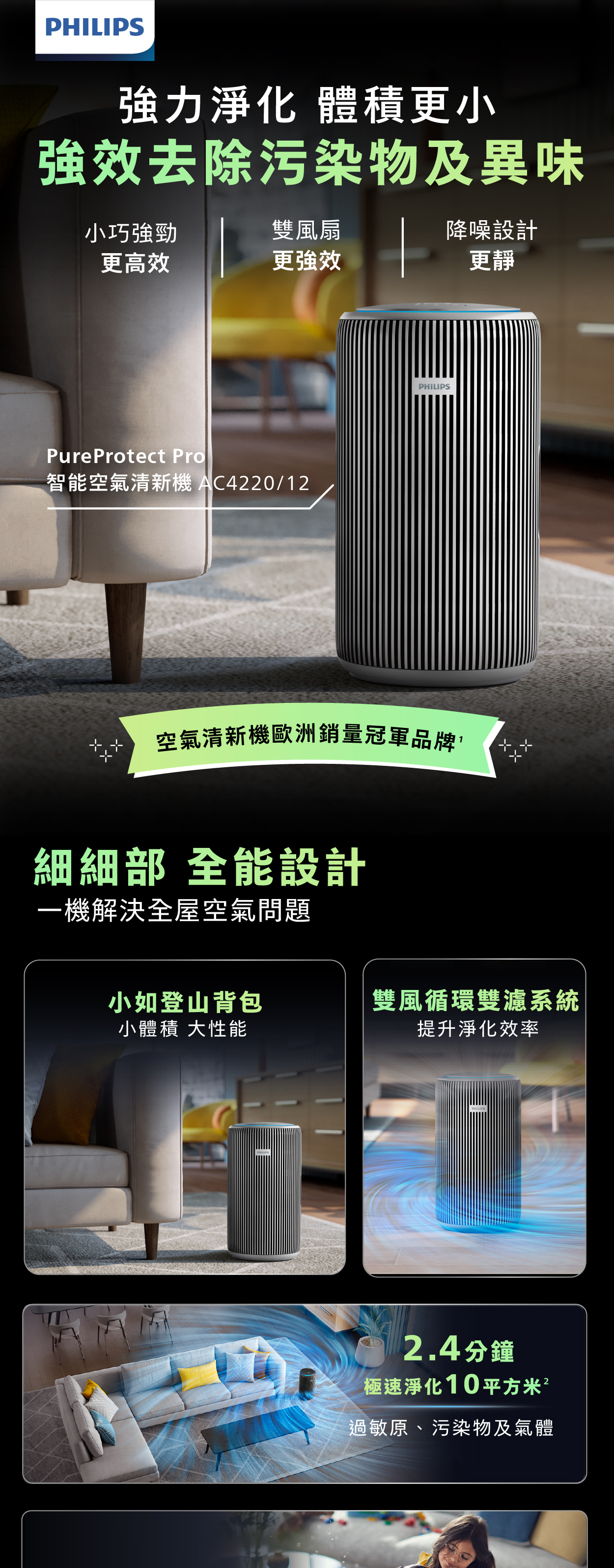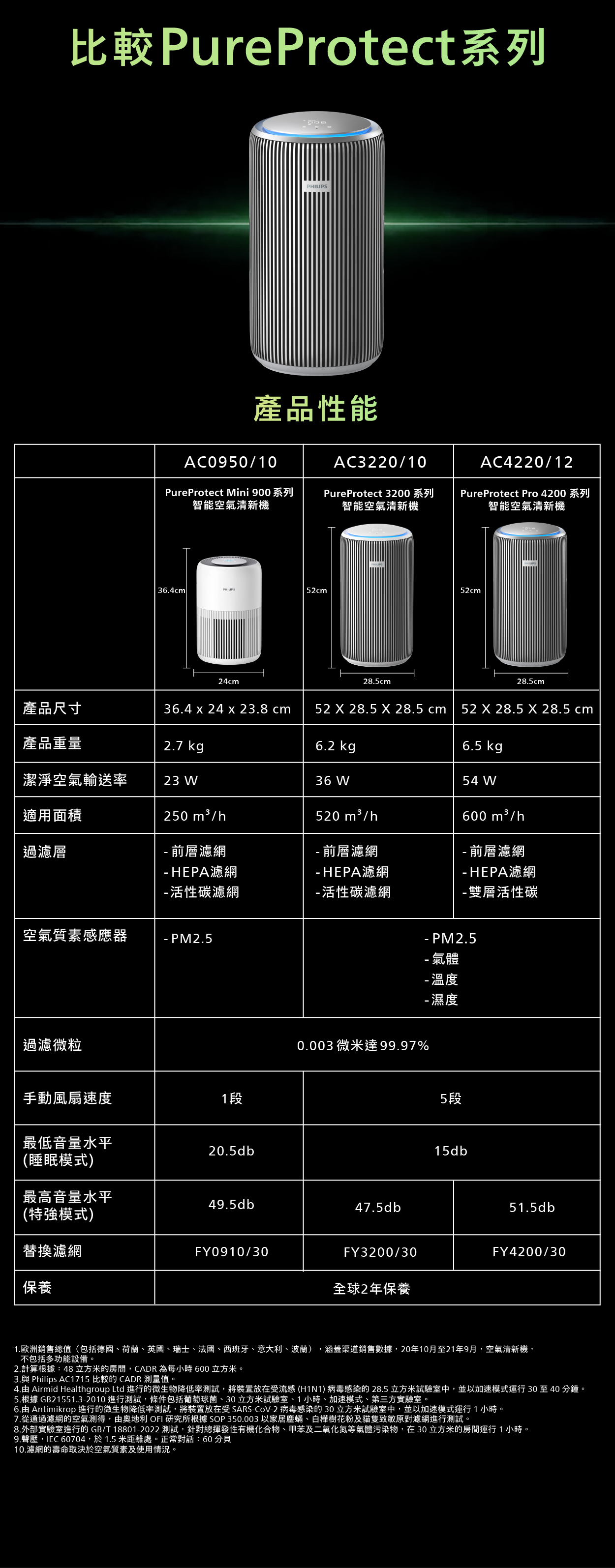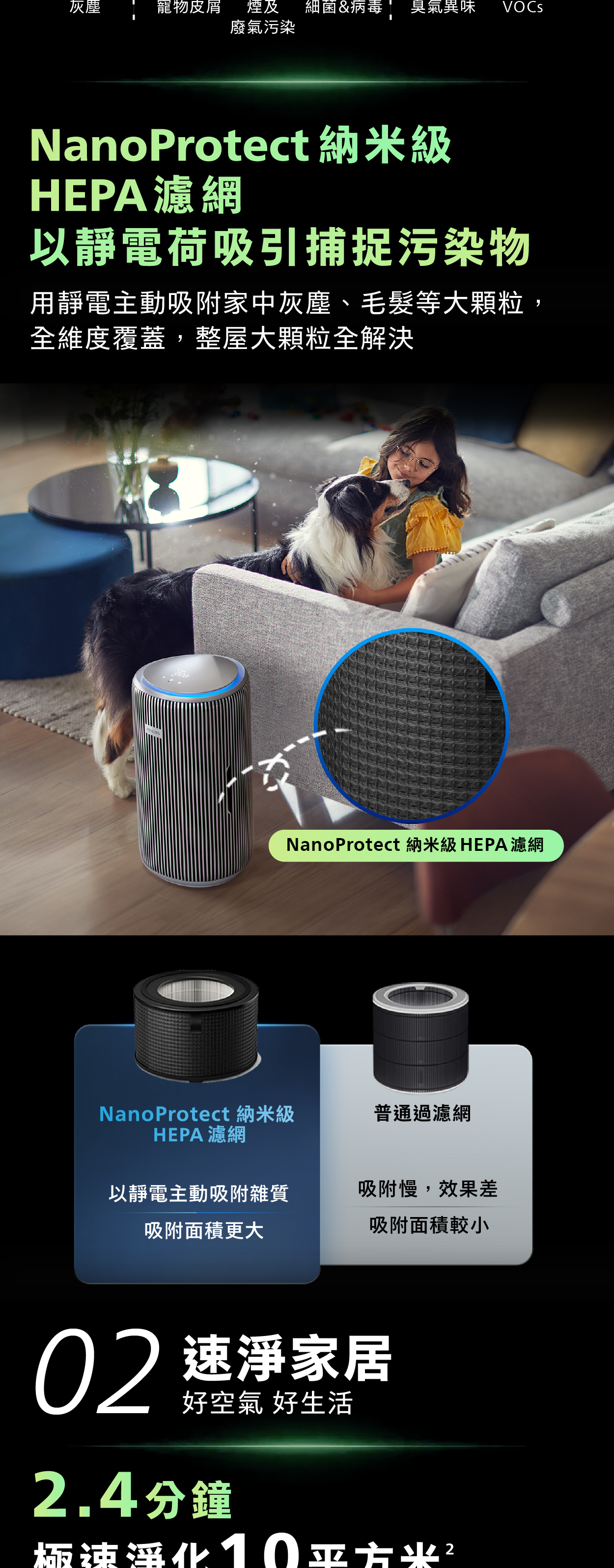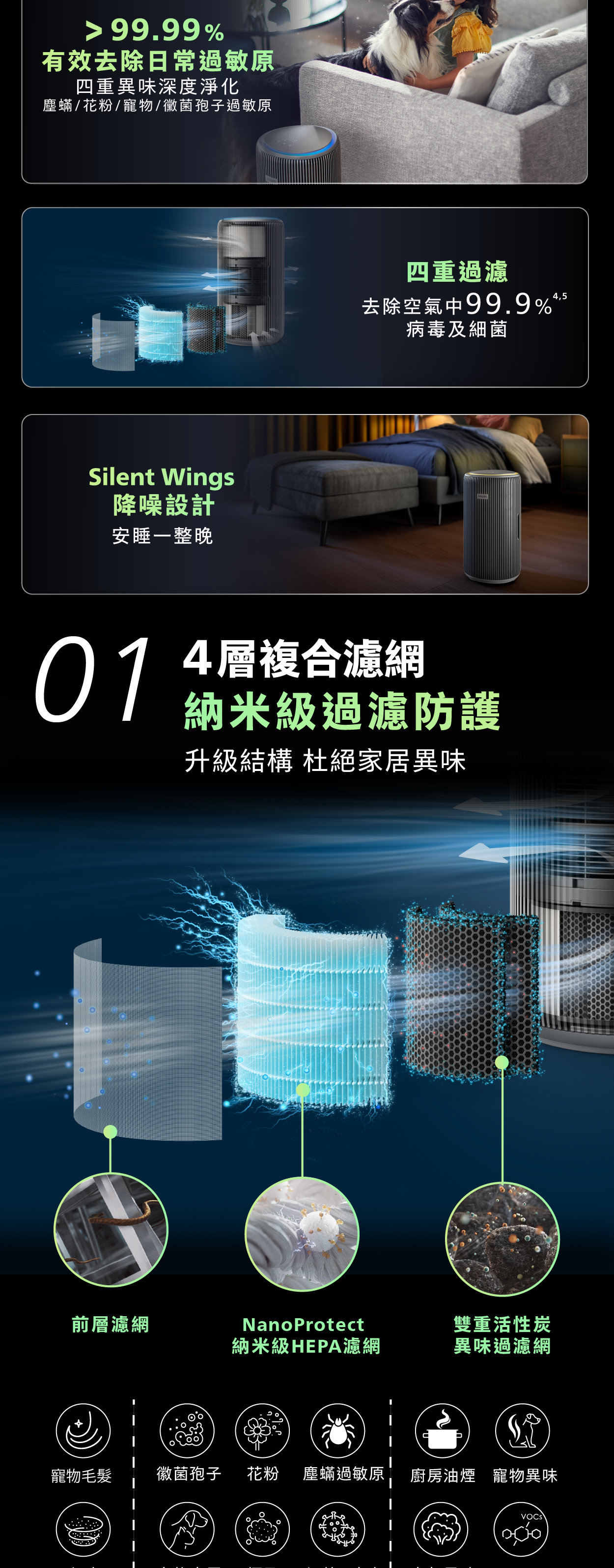 • 4層複合濾網 :前層濾網、 NanoProtect 納米級防護HEPA濾網和雙層活性碳濾網 ,可捕捉 99.97%細小至0.003微米的超微細粒子