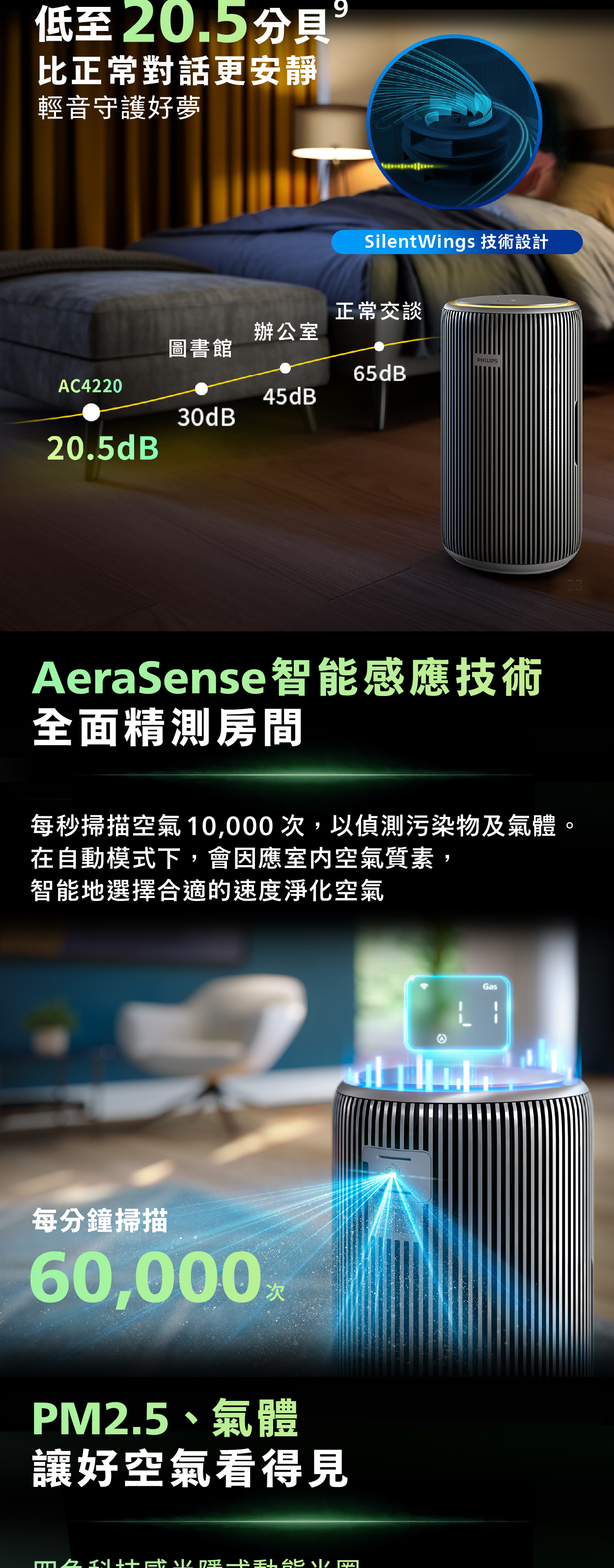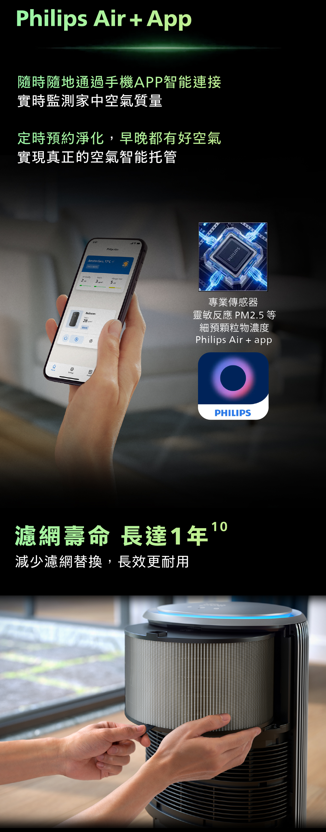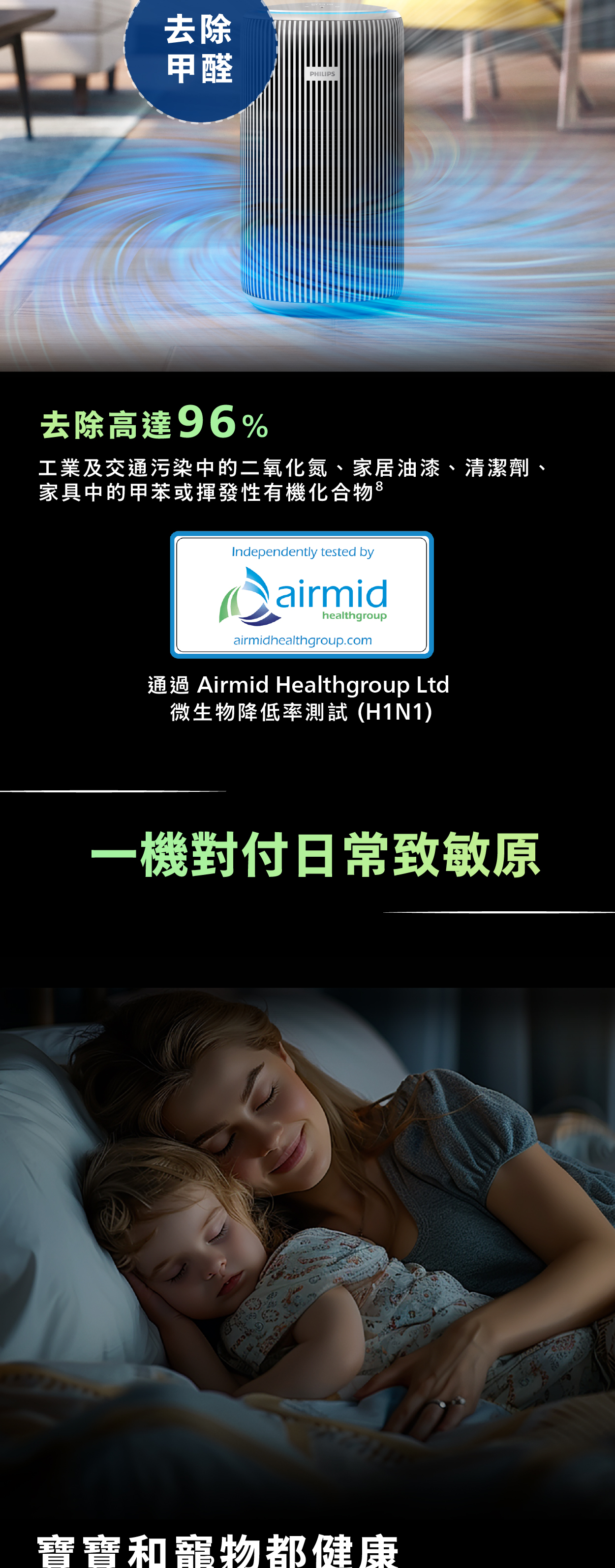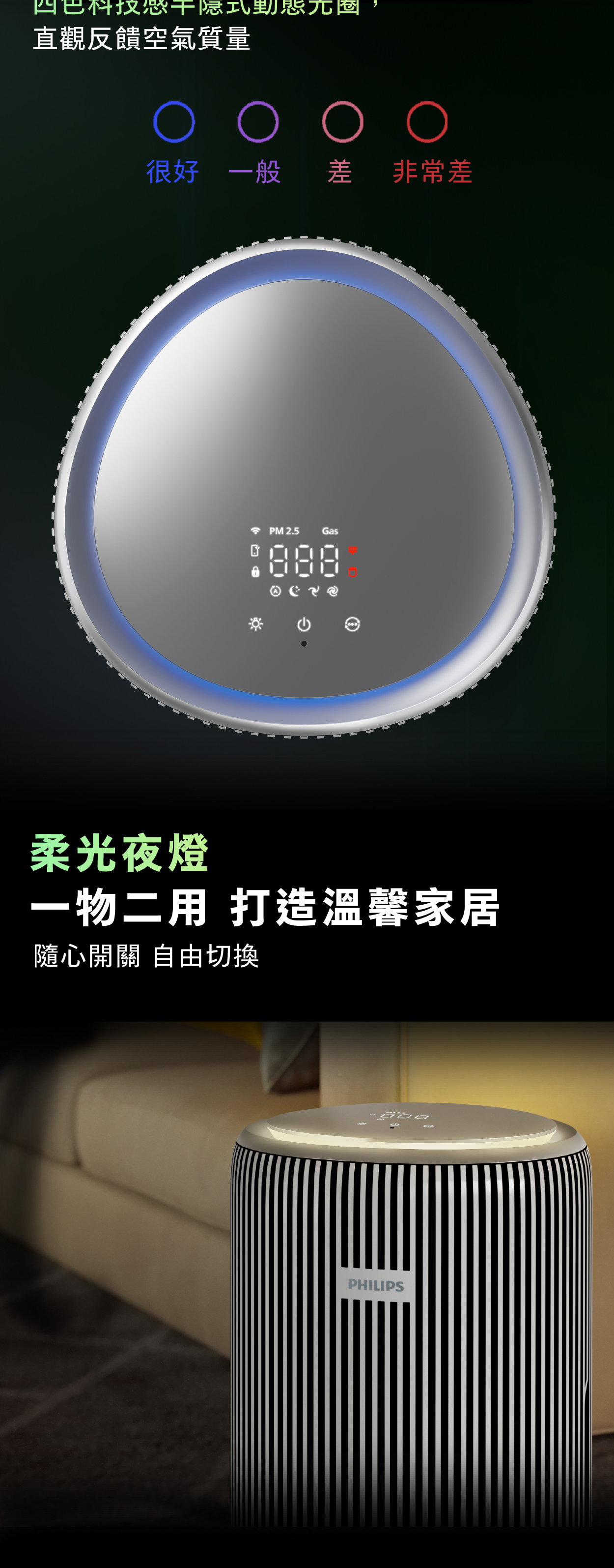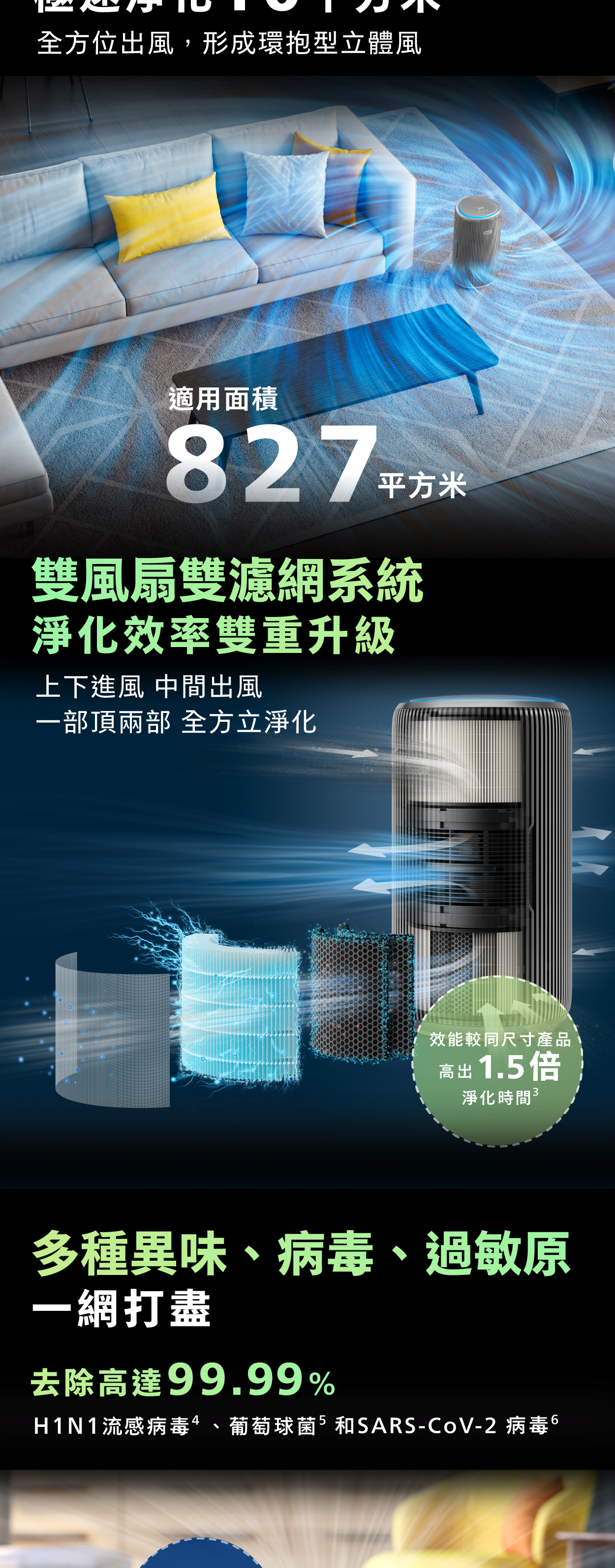 • CADR高達 600 m3/h 的強大過濾能力,可以輕鬆處理高達 76.8平方米的大空間