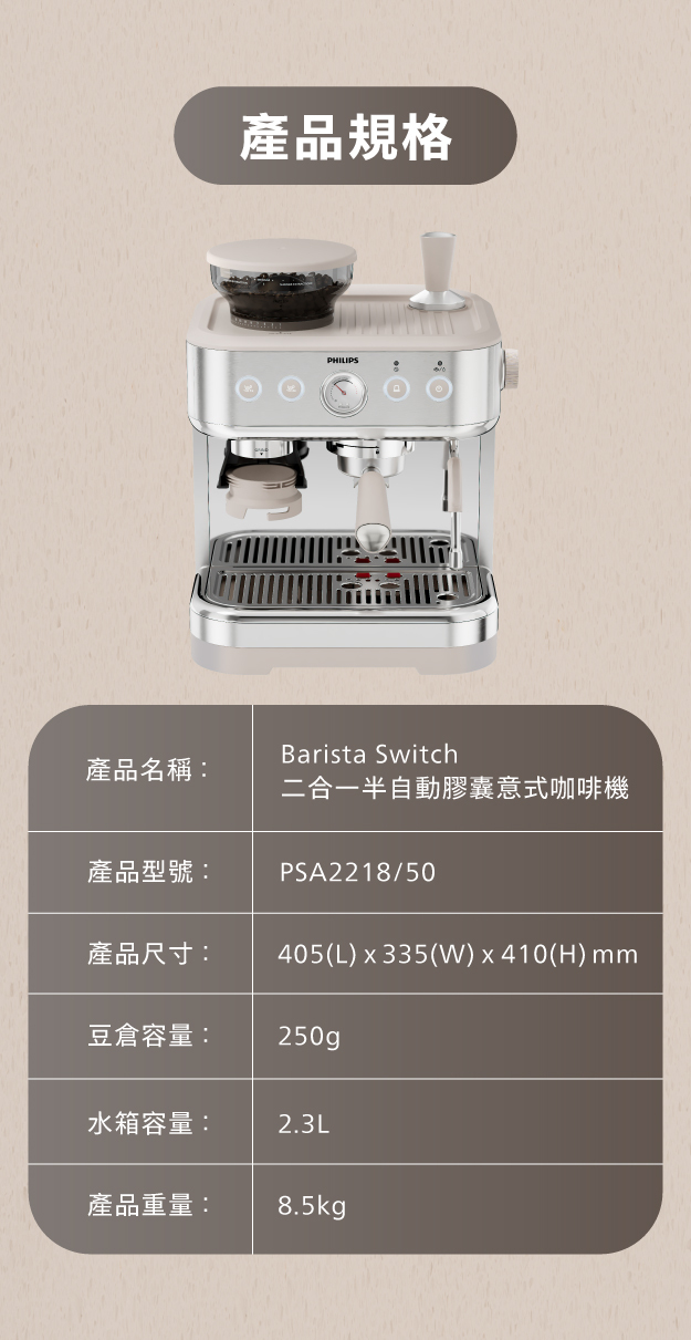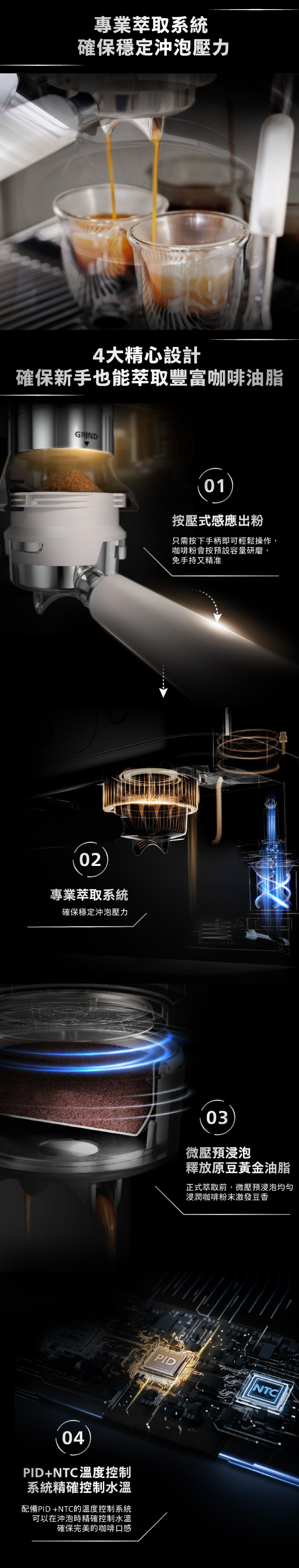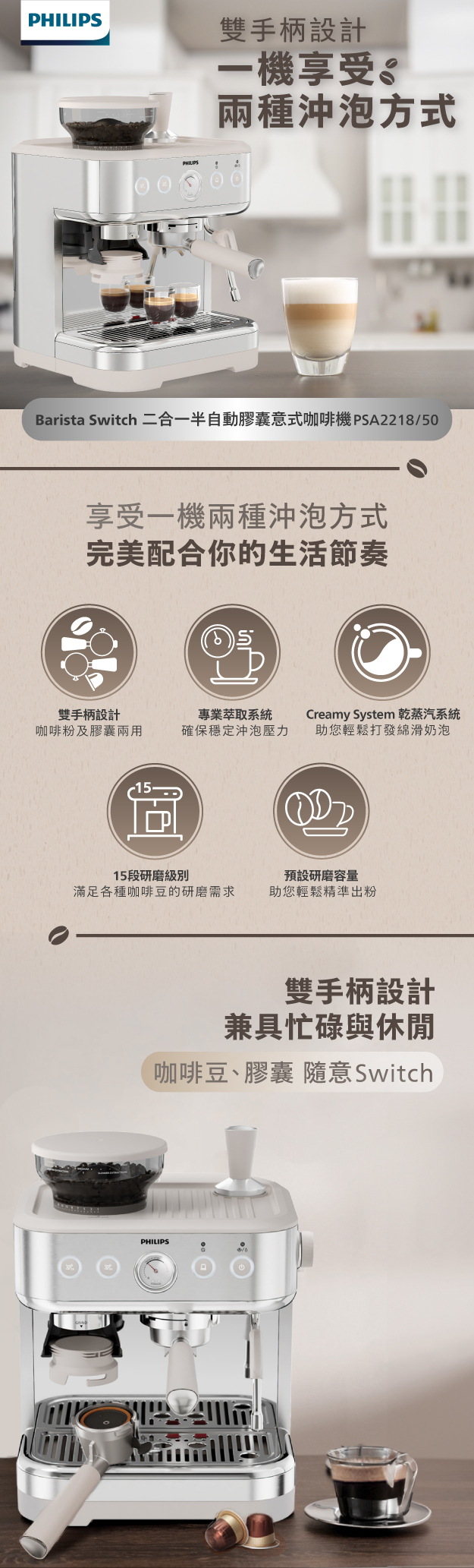 咖啡及膠囊咖啡雙手柄,一機在家 兩種節奏, 專業萃取系統 一機還原醇香意式咖啡