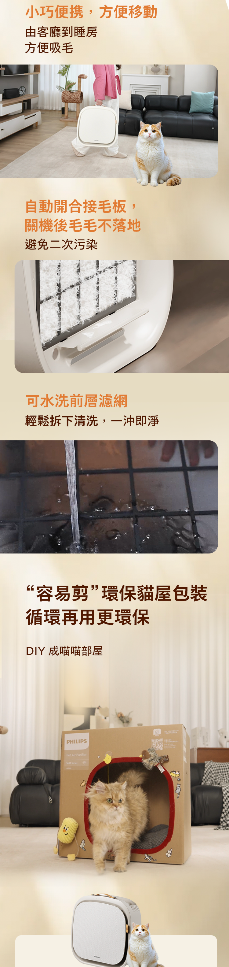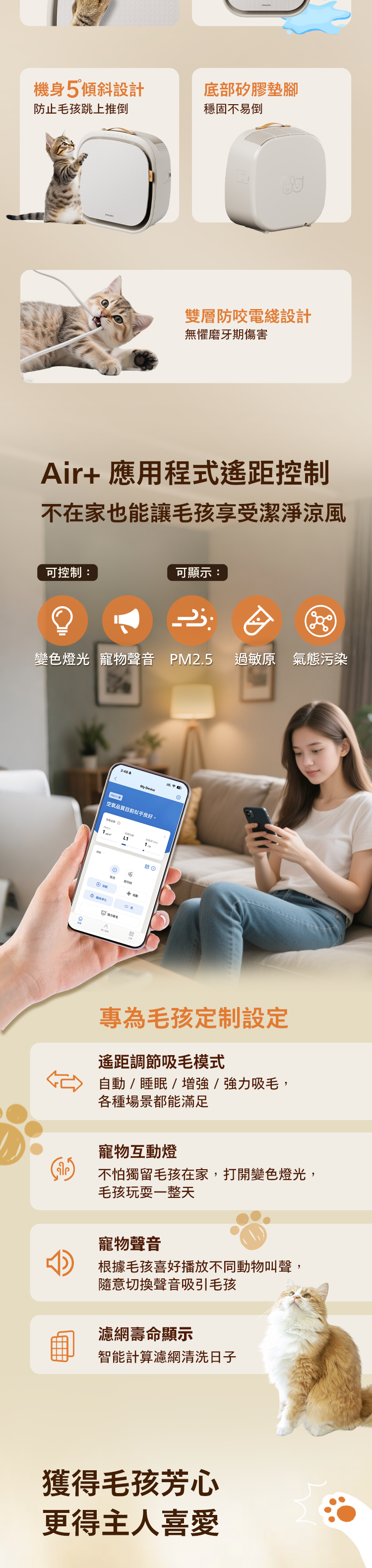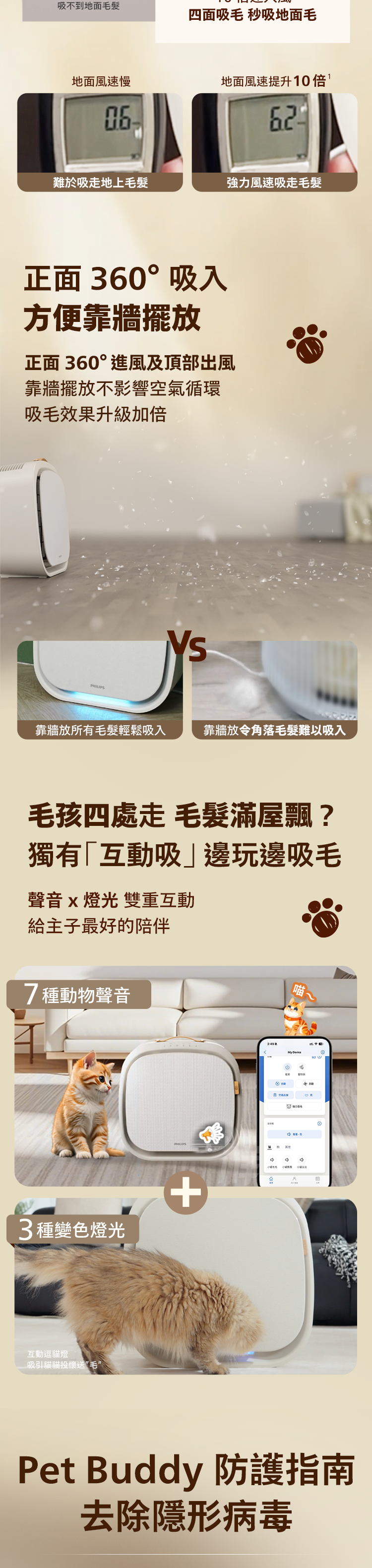 專為寵物家庭設計,有效吸走空中及地上浮毛。採用創新的「互動吸」,以燈光及聲音吸引寵物, 令寵物靠近,邊玩邊吸毛。同時去除寵物異味、細菌、病毒、過敏原。
