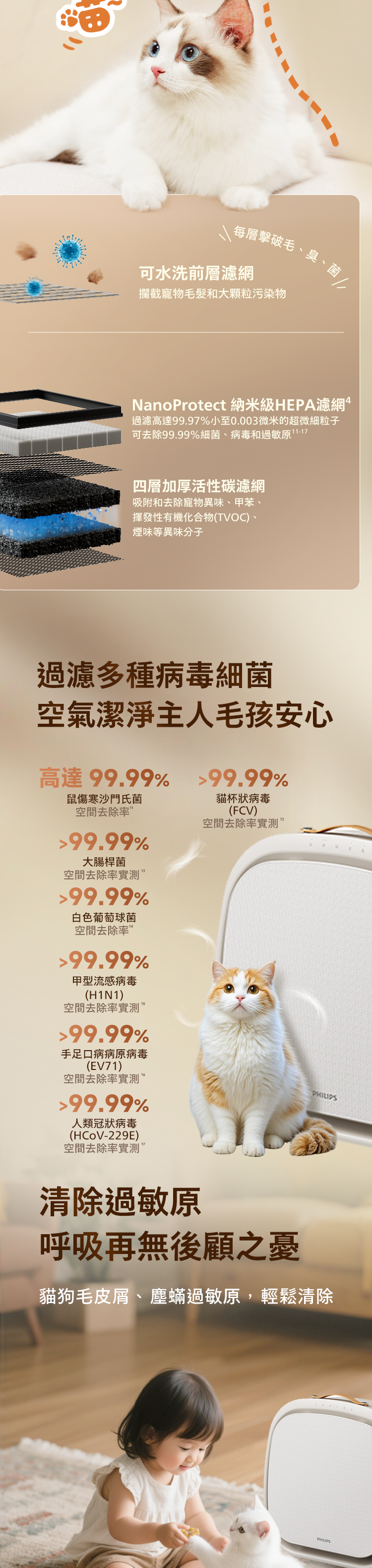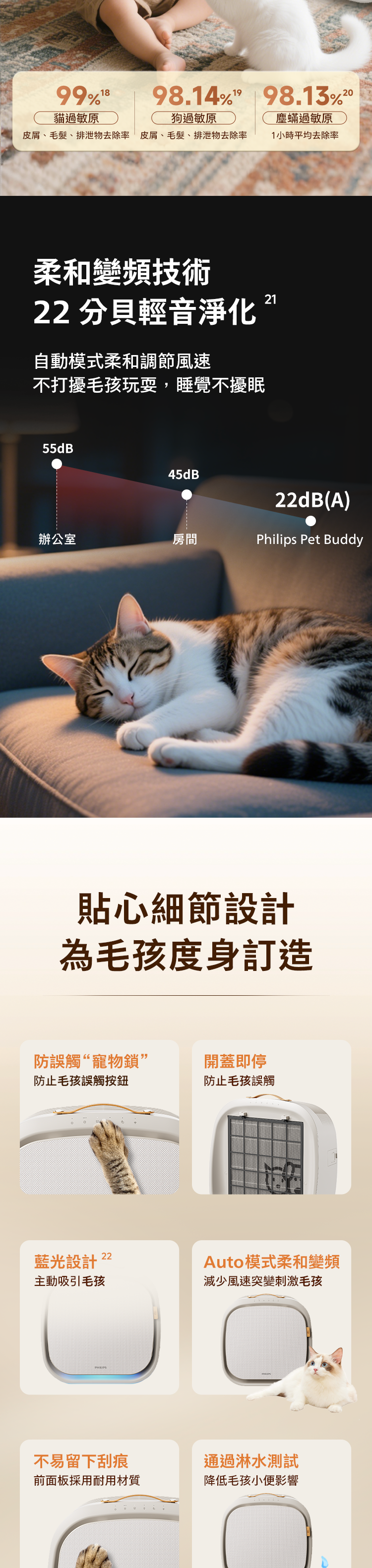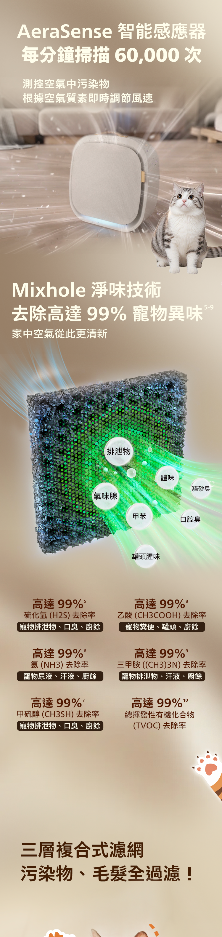 專為寵物家庭設計,有效吸走空中及地上浮毛。採用創新的「互動吸」,以燈光及聲音吸引寵物, 令寵物靠近,邊玩邊吸毛。同時去除寵物異味、細菌、病毒、過敏原。