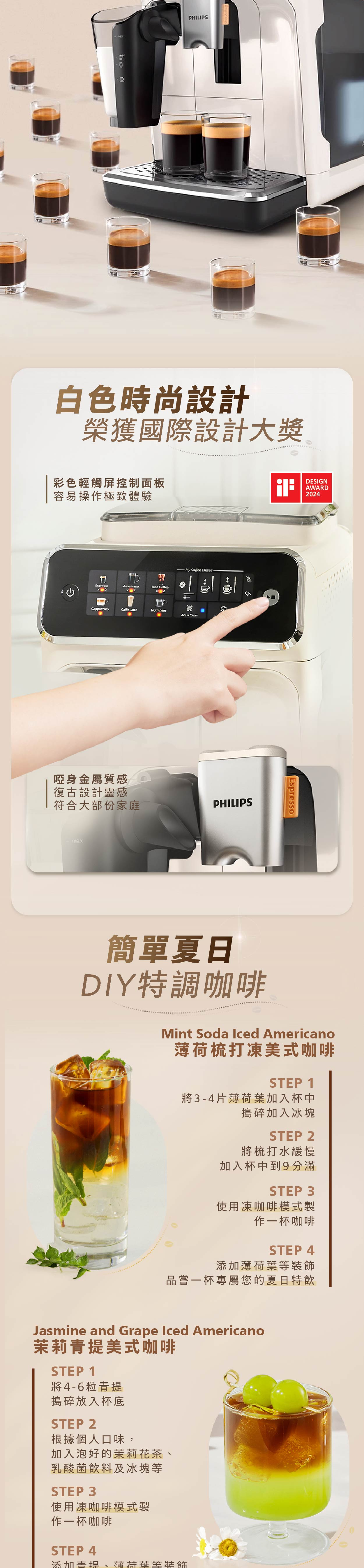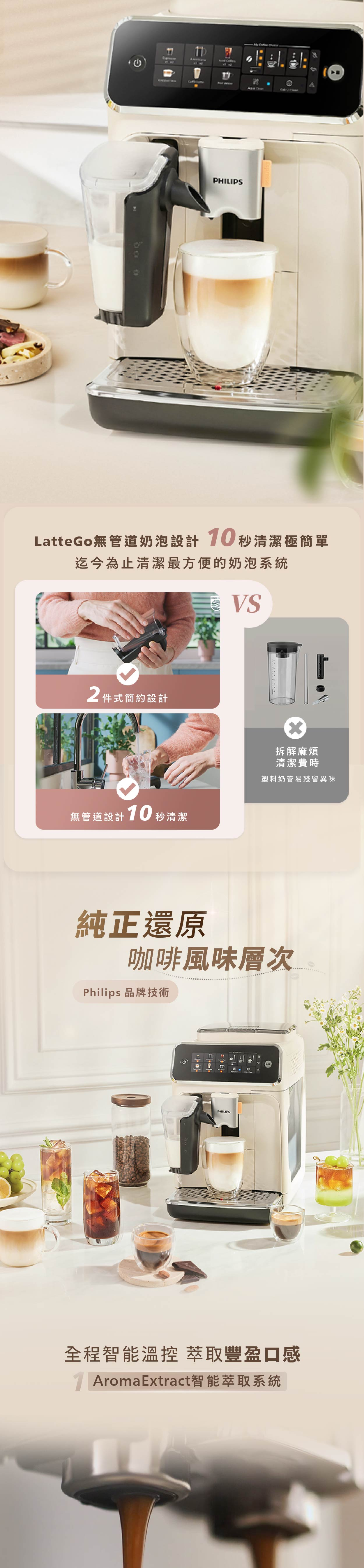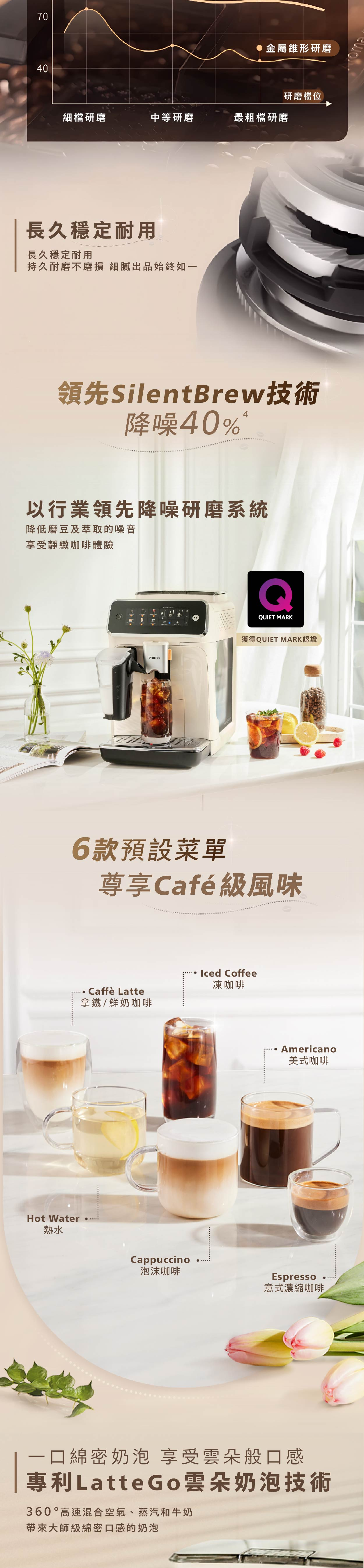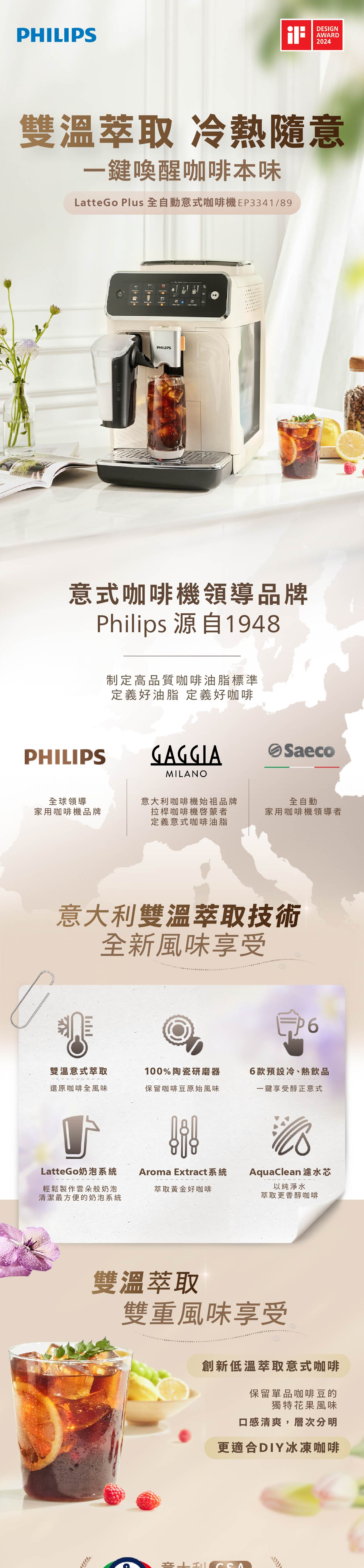 雙溫萃取,冷熱隨意,一鍵喚醒咖啡本味。透過創新的低溫意式萃取技術,呈現冷萃咖啡般的豐富花果香口味,獲意大利CSA咖啡專家認證。專利的LatteGo奶泡系統打造如雲朵般柔滑的奶泡口感。加上SilentBrew技術,讓您享受安靜的咖啡體驗。