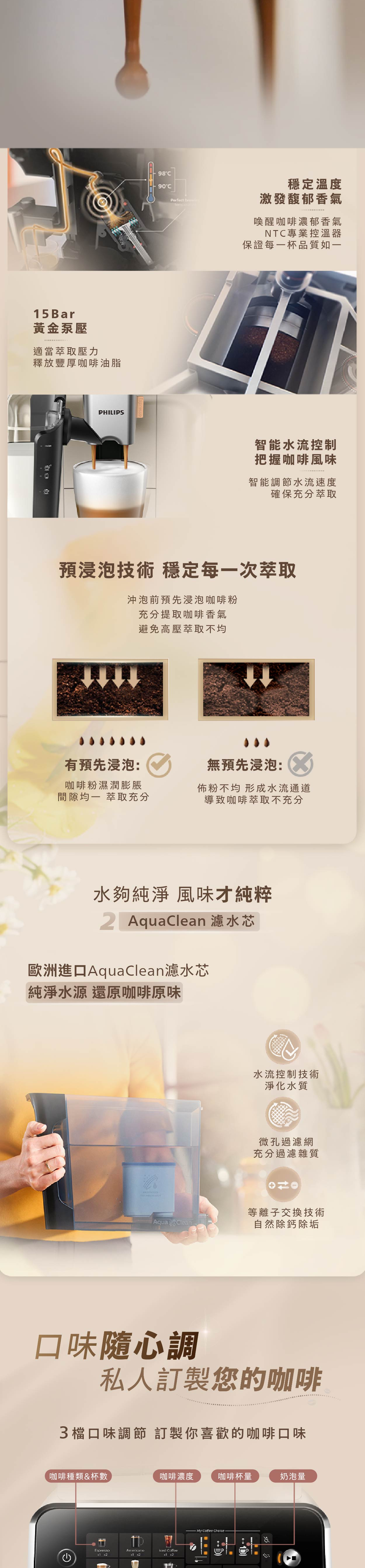 可按照個人喜好調節濃度 (5檔選擇)、水量和奶泡, 特調出專屬的個人風味