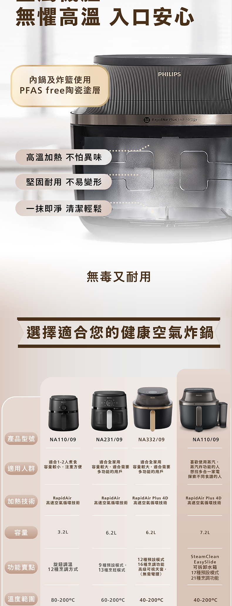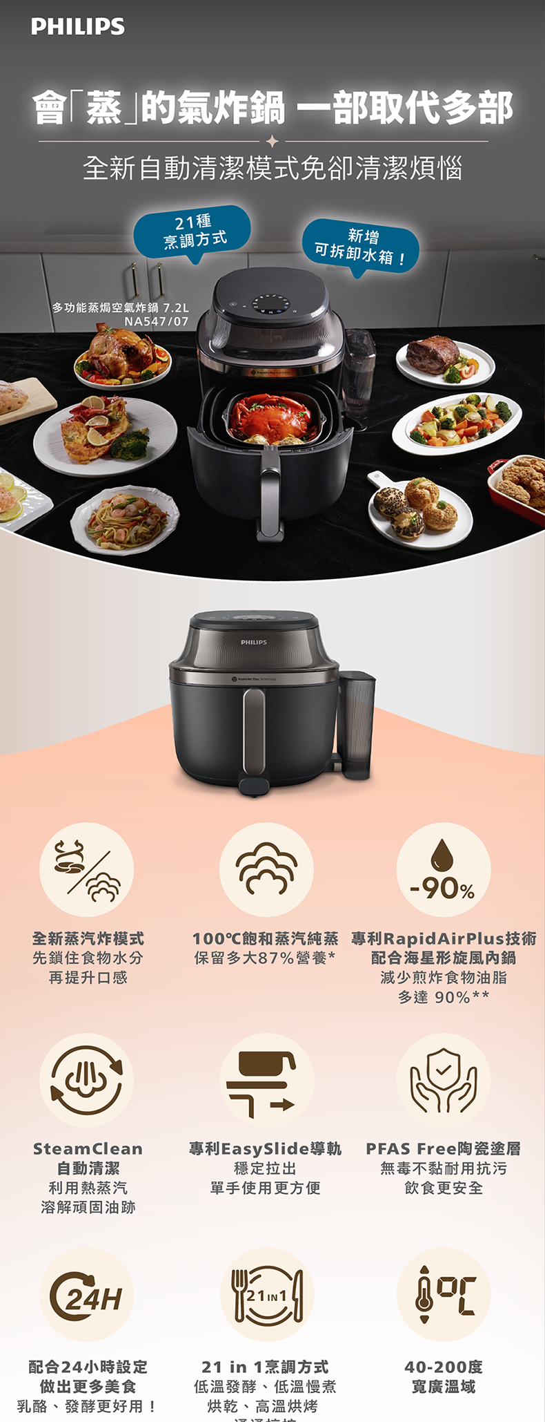 集煎炸、烤、烘、蒸功能, 一部頂替4大廚電功能,滿足多項烹飪需求。創新蒸汽炸模式烹調出外脆鮮嫩的美食,解鎖更多烹調可能性。全新可拆卸水箱設計,體驗更方便清潔與收納,節省空間。一鍵自動清潔模式透過高溫溶解頑固油跡,令清潔更輕鬆。7.2公升容量,内鍋採用PFAS free陶瓷塗層,全家食用更安全。