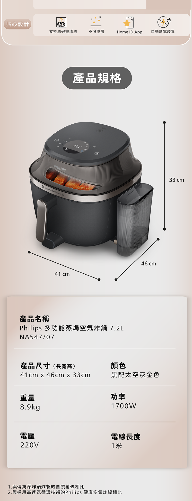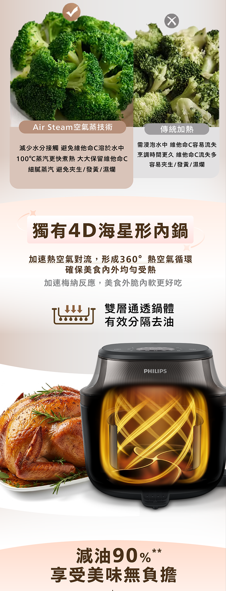 •搭配專利熱空氣循環技術,與傳統深度油炸特定食材(如薯條)的油脂含量相比,在特定測試條件下可減少高達90%的油脂攝入**,提供更輕盈的飲食選擇,減輕傳統油炸帶來的油膩負擔